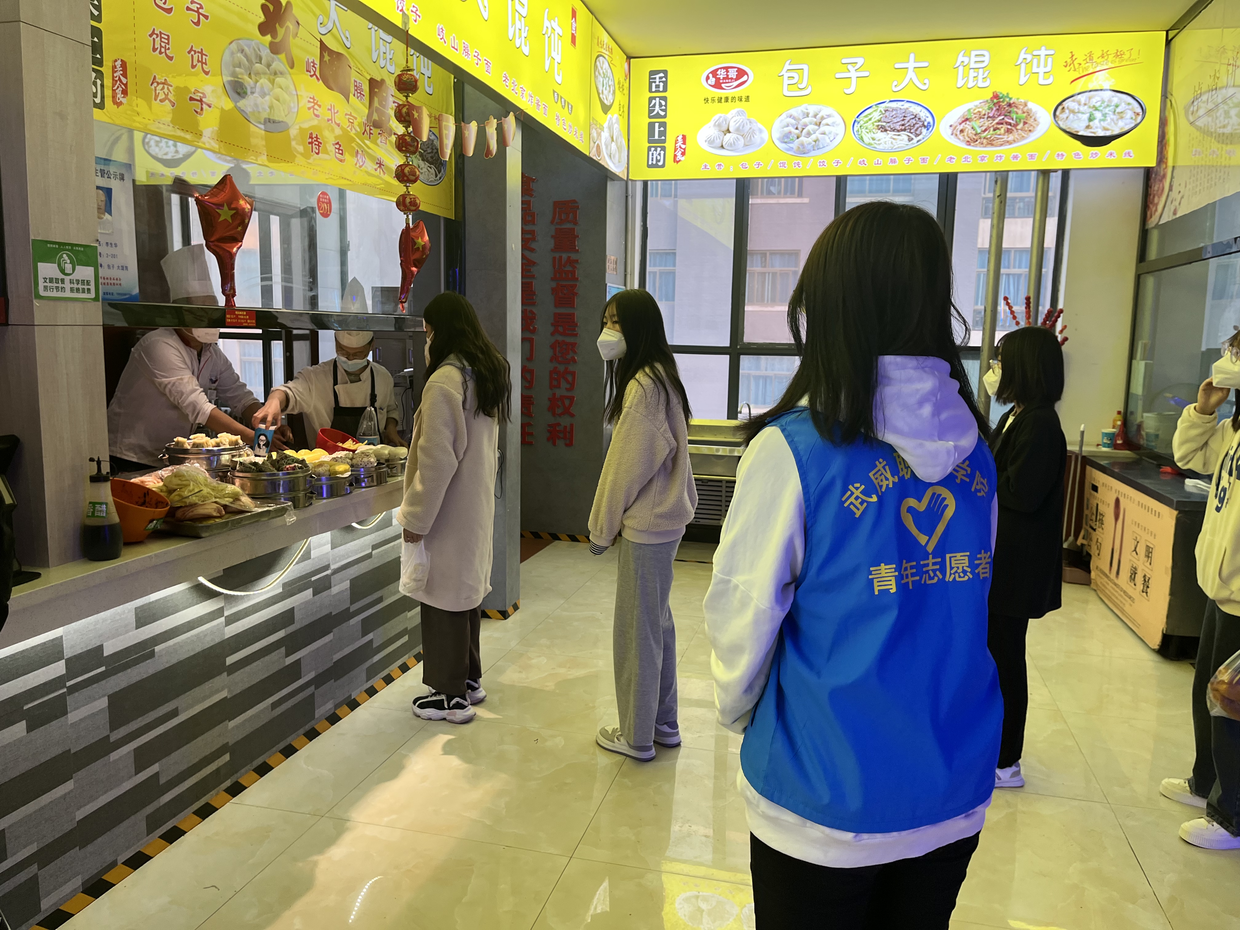 “您好,請(qǐng)測(cè)量體溫、掃場(chǎng)所碼?!薄罢?qǐng)佩戴好口罩,有序排隊(duì)……”校學(xué)生會(huì)的陶玲在學(xué)校食堂門口值班時(shí)不停地提醒著進(jìn)出打飯的同學(xué)們,這也是她參加校園疫情防控以來(lái)每天講得最多的話。自10月13日涼州區(qū)實(shí)施臨時(shí)管控以來(lái),學(xué)校各學(xué)生組織聞令而動(dòng),身穿“藍(lán)馬甲”積極投身校園疫情防控一線,用奉獻(xiàn)溫暖了這個(gè)秋天。