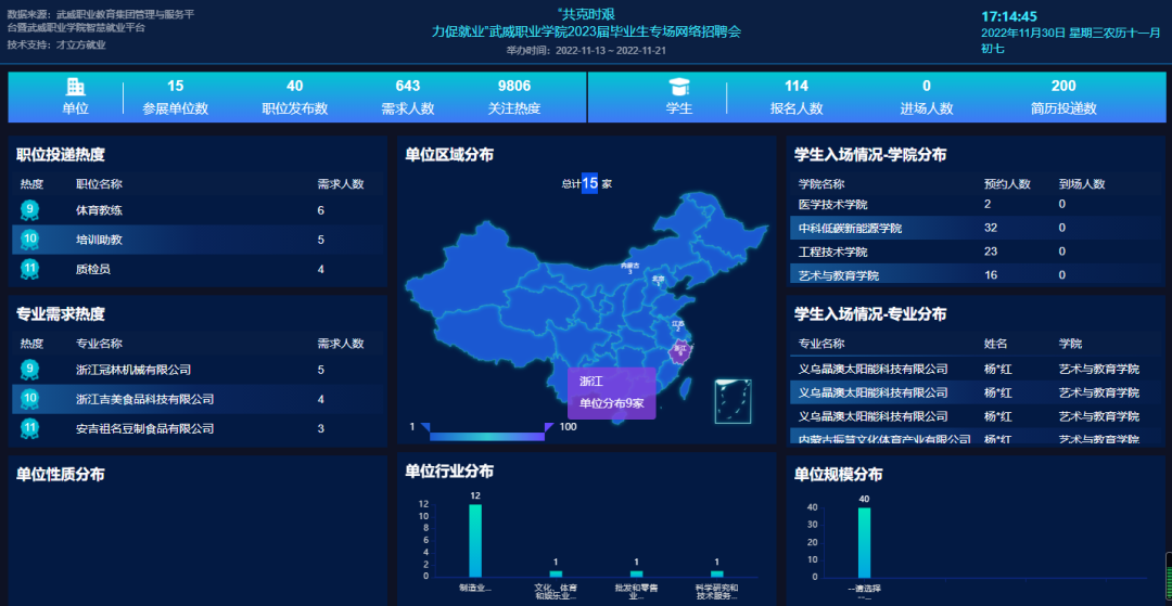 本次云聘系列活動(dòng)分兩個(gè)階段舉行,第一階段為“共克時(shí)艱力促就業(yè)”武威職業(yè)學(xué)院2023屆畢業(yè)生專場(chǎng)網(wǎng)絡(luò)招聘會(huì),于11月7日至11月21日舉行。本次招聘會(huì)主要面向在疫情條件下,能夠?qū)\?chē)接運(yùn)學(xué)生赴企業(yè)就業(yè)的單位。湖州市安吉縣人力資源和社會(huì)保障局組織10余家當(dāng)?shù)仄髽I(yè)參加了本次招聘會(huì),同時(shí)吸引內(nèi)蒙古靈圣作物科技有限公司、江蘇京東信息技術(shù)有限公司、義烏晶澳太陽(yáng)能科技有限公司、內(nèi)蒙古振慧文化體育產(chǎn)業(yè)有限公司等企業(yè)參加,提供招聘職位40個(gè),需求人數(shù)643人,招聘會(huì)關(guān)注人次達(dá)9806,200余人投遞簡(jiǎn)歷。