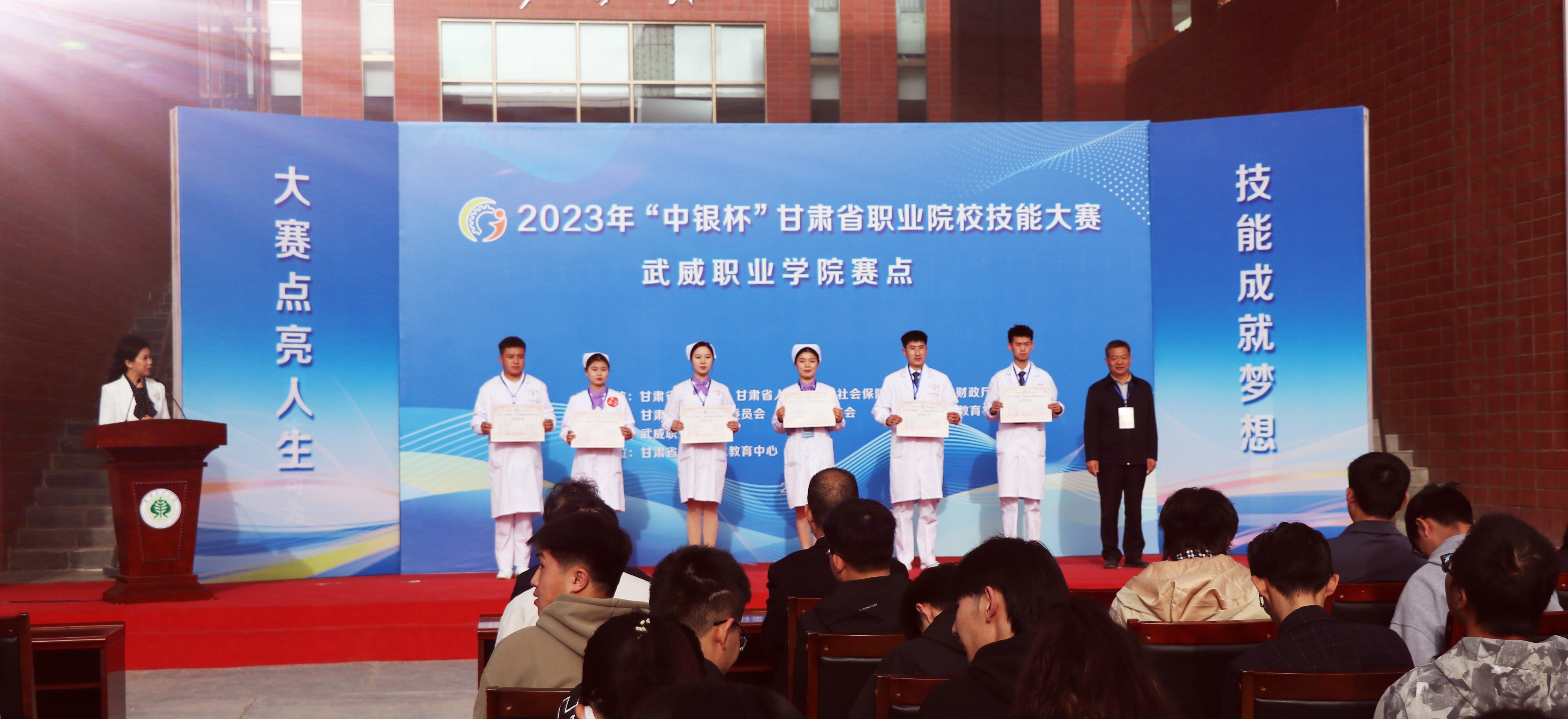 為全面貫徹落實省委辦公廳、省政府辦公廳《關于推動現(xiàn)代職業(yè)教育高質量發(fā)展,加快“技能甘肅”建設的若干措施》,進一步推動打造“技能甘肅”工作,促進職業(yè)學校專業(yè)建設與教學改革,提高學生實踐動手能力和職業(yè)素養(yǎng),弘揚勞動光榮、技能寶貴、創(chuàng)造偉大的時代風尚,引領職業(yè)學校適應行業(yè)現(xiàn)狀及技術發(fā)展趨勢,檢驗教學成果,促進護理專業(yè)的教育教學改革。4月10日-4月12日,2023年“中銀杯”甘肅省職業(yè)院校技能大賽護理技能賽項在武威職業(yè)學院順利舉行。來自全省10所高職院校的25個團隊、50名學生和22名教師選手匯集武威職業(yè)學院賽場,共同譜寫護理人的工匠精神和大愛情懷。