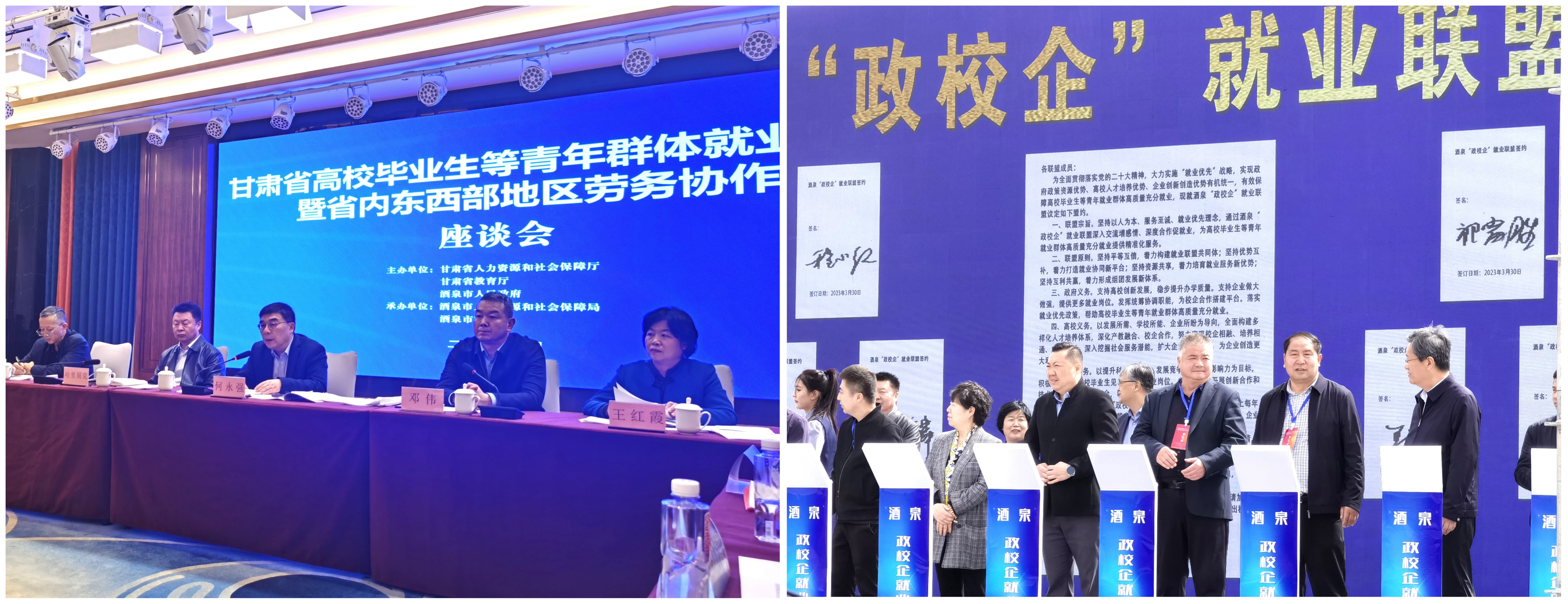 3月30日,王守云帶領招生就業(yè)處、合作教育辦負責人董鵬,在酒泉市參加了由甘肅省人社廳、教育廳組織舉辦的“甘肅省高校畢業(yè)生等青年群體就業(yè)暨省內東西部地區(qū)勞務協(xié)作”座談會與招聘會,并進行了政校企就業(yè)聯(lián)盟簽約活動。王守云代表武威職業(yè)學院在會上做了題為“政校企聯(lián)動深化校企合作,促進畢業(yè)生高質量充分就業(yè)”的交流發(fā)言。