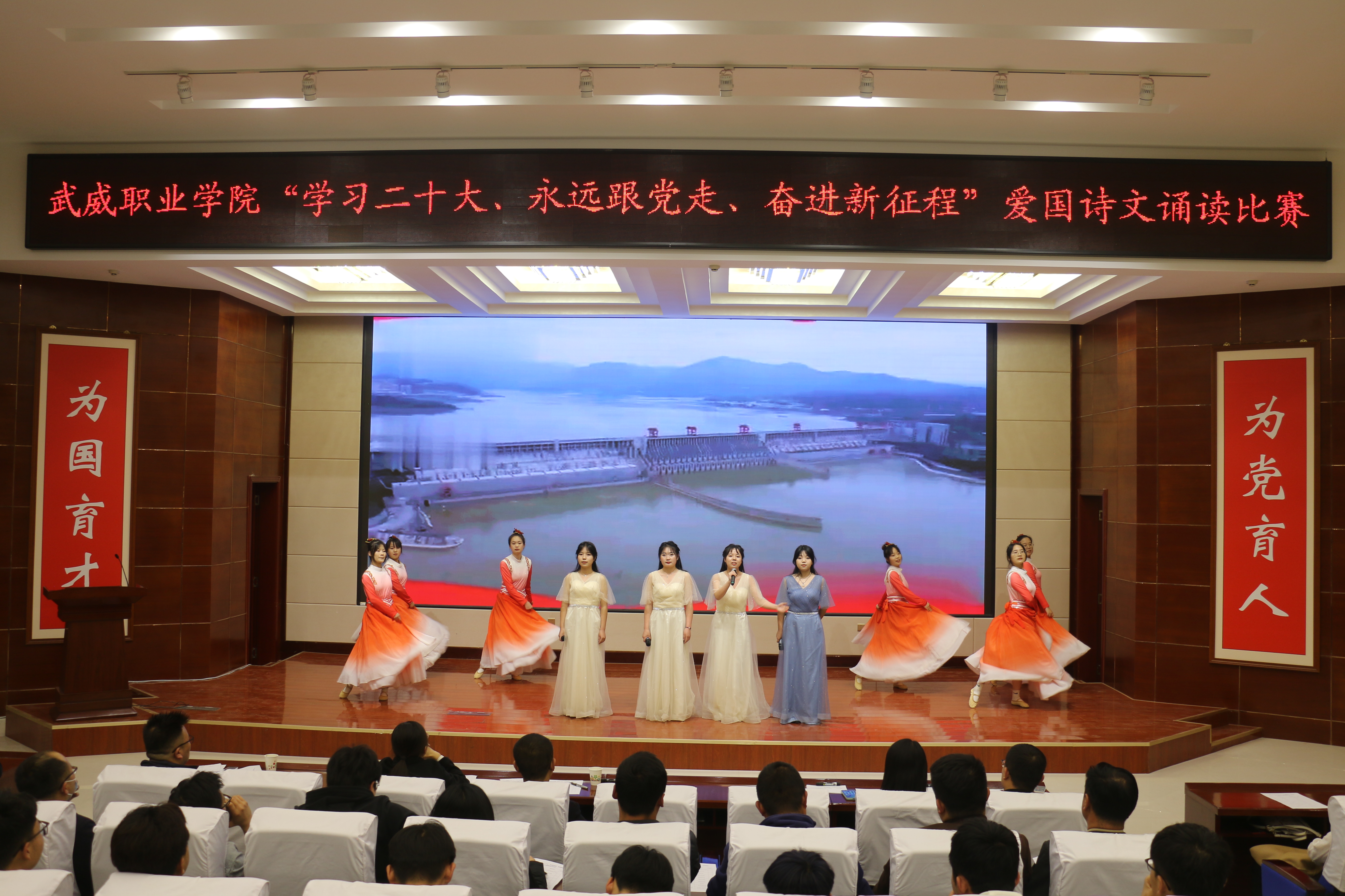 大賽于3月啟動(dòng),歷時(shí)一個(gè)月,各二級(jí)學(xué)院經(jīng)過初賽評(píng)比推選出9個(gè)優(yōu)秀節(jié)目入圍決賽。比賽現(xiàn)場(chǎng),各參賽隊(duì)以“學(xué)習(xí)二十大、永遠(yuǎn)跟黨走、奮進(jìn)新征程”為主題,將傳承經(jīng)典詩文和弘揚(yáng)愛國主義精神結(jié)合,誦詩抒情、借詞言志,熱情謳歌中國共產(chǎn)黨不懈奮斗的光輝歷程,全面展現(xiàn)新時(shí)代青年以夢(mèng)為馬,不負(fù)韶華的青春風(fēng)貌。校團(tuán)委原創(chuàng)編排表演的節(jié)目《追夢(mèng)八步沙,奮斗正青春》,深情動(dòng)人,感染全場(chǎng),歌頌了“六老漢”矢志艱苦奮斗的隴人品格,抒發(fā)了當(dāng)代青年永跟黨走,青春建功的豪情壯志。富余藝術(shù)感染力的經(jīng)典吟誦,穿插舞蹈、劇情和紅歌演唱,為廣大師生呈現(xiàn)了一場(chǎng)視聽盛宴。