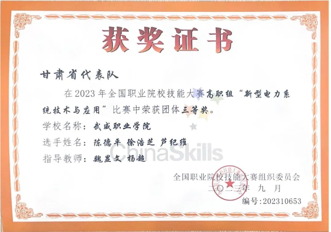在2023年全國職業(yè)院校技能大賽中中科低碳新能源技術學院學生陳德平、徐浩芝、蘆紀維獲得高職組新型電力系統(tǒng)技術與應用賽項團體三等獎。