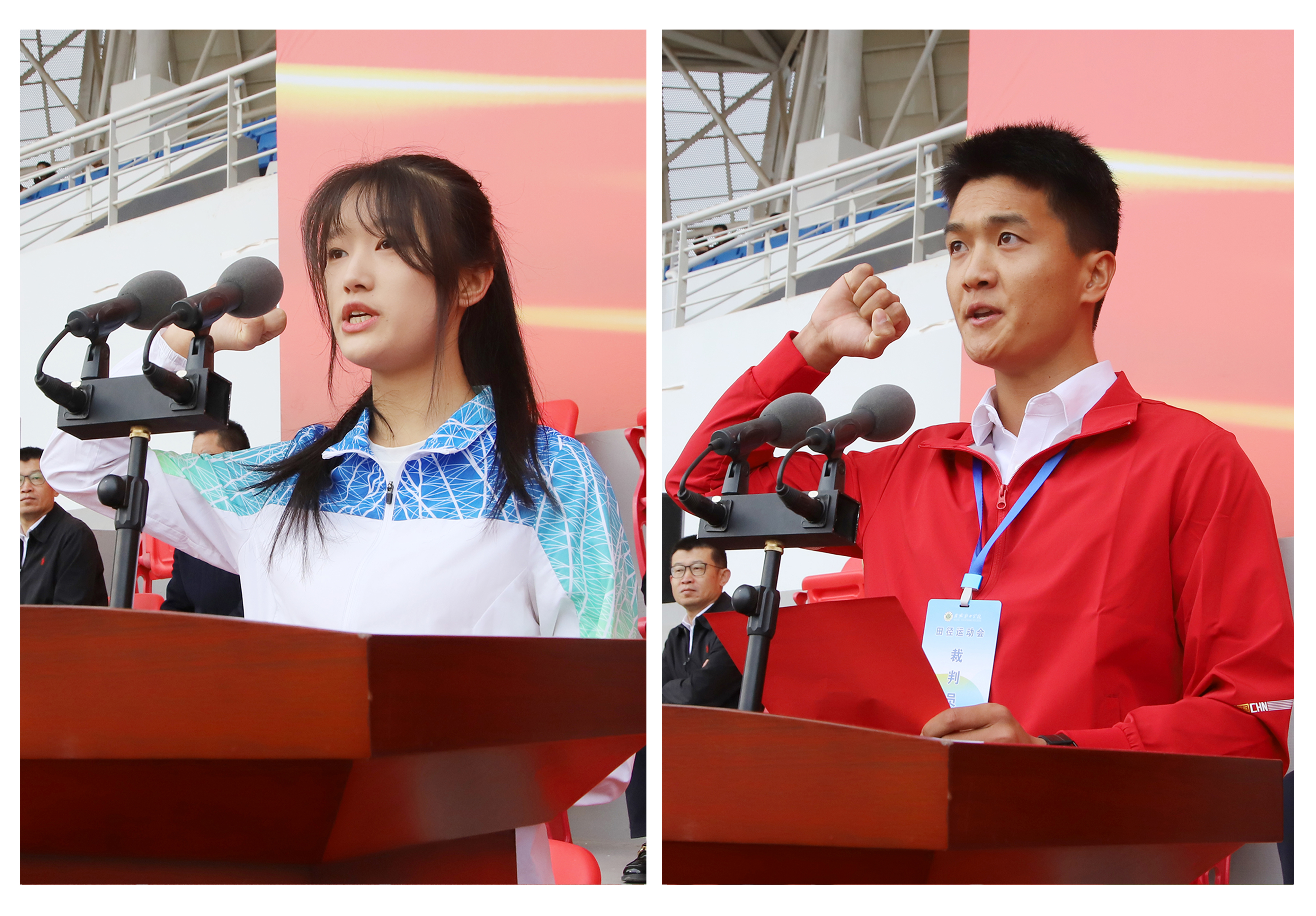 開幕式上,侯昊燁同學(xué)和吳績(jī)?nèi)鹄蠋煼謩e代表運(yùn)動(dòng)員和裁判員進(jìn)行了莊嚴(yán)的宣誓。