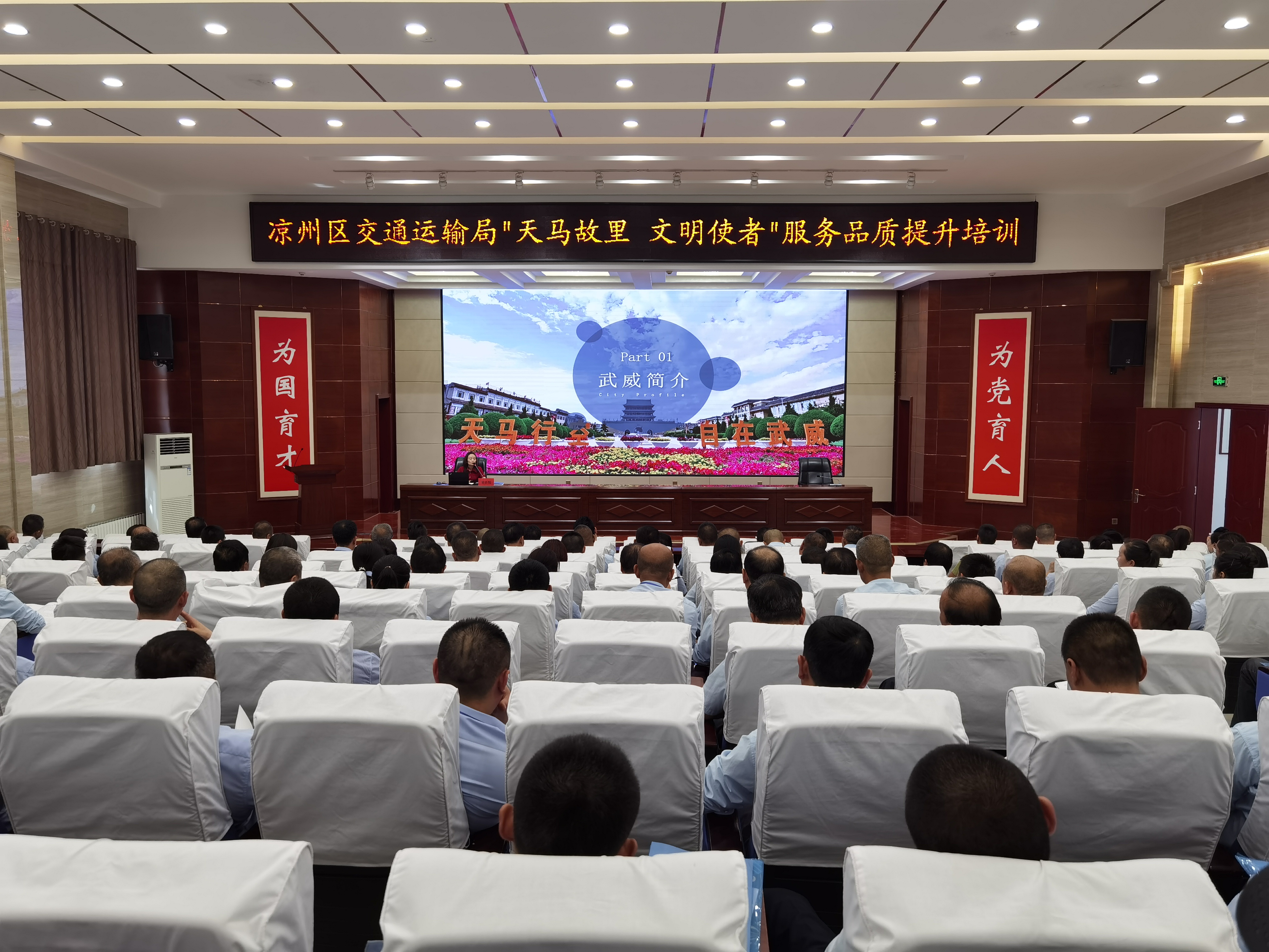 6月28日,“天馬故里 文明使者”客運企業(yè)從業(yè)人員服務品質提升培訓班在武威職業(yè)學院開班。市交通局副局長柴天祥,區(qū)委常委、統(tǒng)戰(zhàn)部部長、區(qū)政協(xié)黨組書記許娜,市交通運輸綜合行政執(zhí)法隊隊長韓世泰,市運管局副局長許培明,學校黨委委員、副校長王守云出席開班儀式。開班式由涼州區(qū)交通運輸局副局長蘇銀堂主持,出租客運公司、城市公交公司和定制客運公司管理人員及從業(yè)人員220人參加開班儀式。