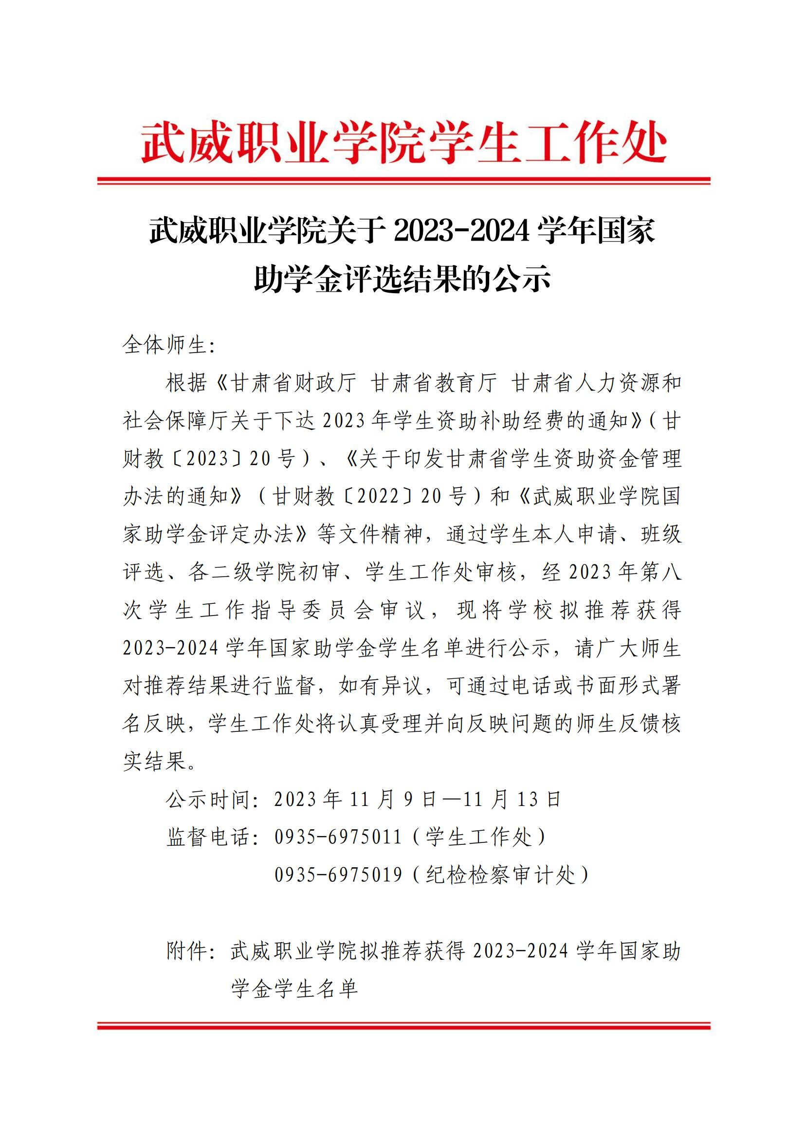 武威職業(yè)學(xué)院關(guān)于2023-2024學(xué)年國(guó)家助學(xué)金評(píng)選結(jié)果的公示