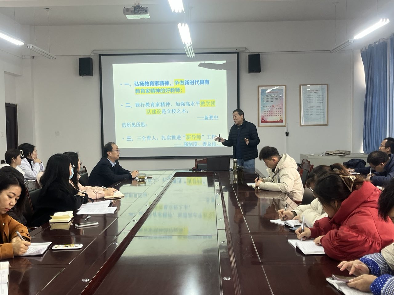 楊存忠教授主要從“弘揚(yáng)教育家精神,爭做新時(shí)代具有教育家精神的好老師”、“踐行教育家精神,加強(qiáng)高水平教學(xué)團(tuán)隊(duì)建設(shè)”、“三全育人,扎實(shí)推進(jìn)班導(dǎo)師工作”以及“如何上好一堂課”四部分展開。楊存忠教授解讀了中國特有教育家精神的內(nèi)涵;闡述了堅(jiān)持師德師風(fēng)第一標(biāo)準(zhǔn),大力弘揚(yáng)教育家精神的重要意義和基本要求;結(jié)合典型案例,以案為戒,勉勵(lì)新時(shí)代教師既精通專業(yè)知識、做好“經(jīng)師”,又涵養(yǎng)德行、成為“人師”,努力做精于傳道授業(yè)解惑的“經(jīng)師”和“人師”的統(tǒng)一者。楊存忠教授還就如何上好一堂課與老師們進(jìn)行了深入交流。