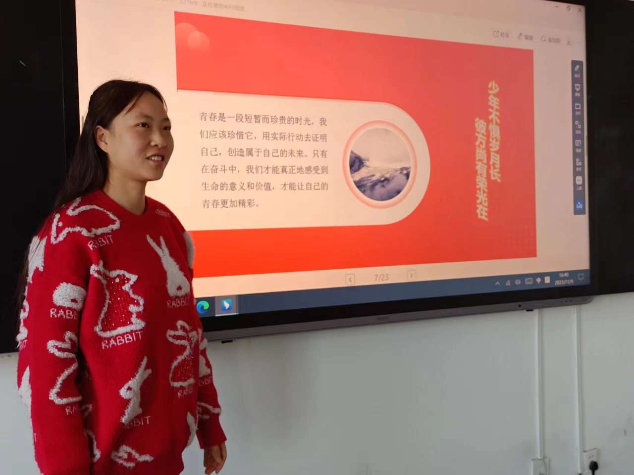 藝術(shù)與教育學(xué)院2021級(jí)學(xué)生后麗婷分享了自己參加“三下鄉(xiāng)”社會(huì)實(shí)踐服務(wù)團(tuán)隊(duì),走進(jìn)基層社區(qū)開展志愿服務(wù)活動(dòng),在基層體悟中不斷增強(qiáng)責(zé)任感和使命感,在社會(huì)課堂中“受教育、長(zhǎng)才干、作貢獻(xiàn)”的事跡。她期盼各位學(xué)子做新時(shí)代好青年,如螢火一般,有一分熱便發(fā)一分光,以奮斗來點(diǎn)亮青春最亮麗的底色。