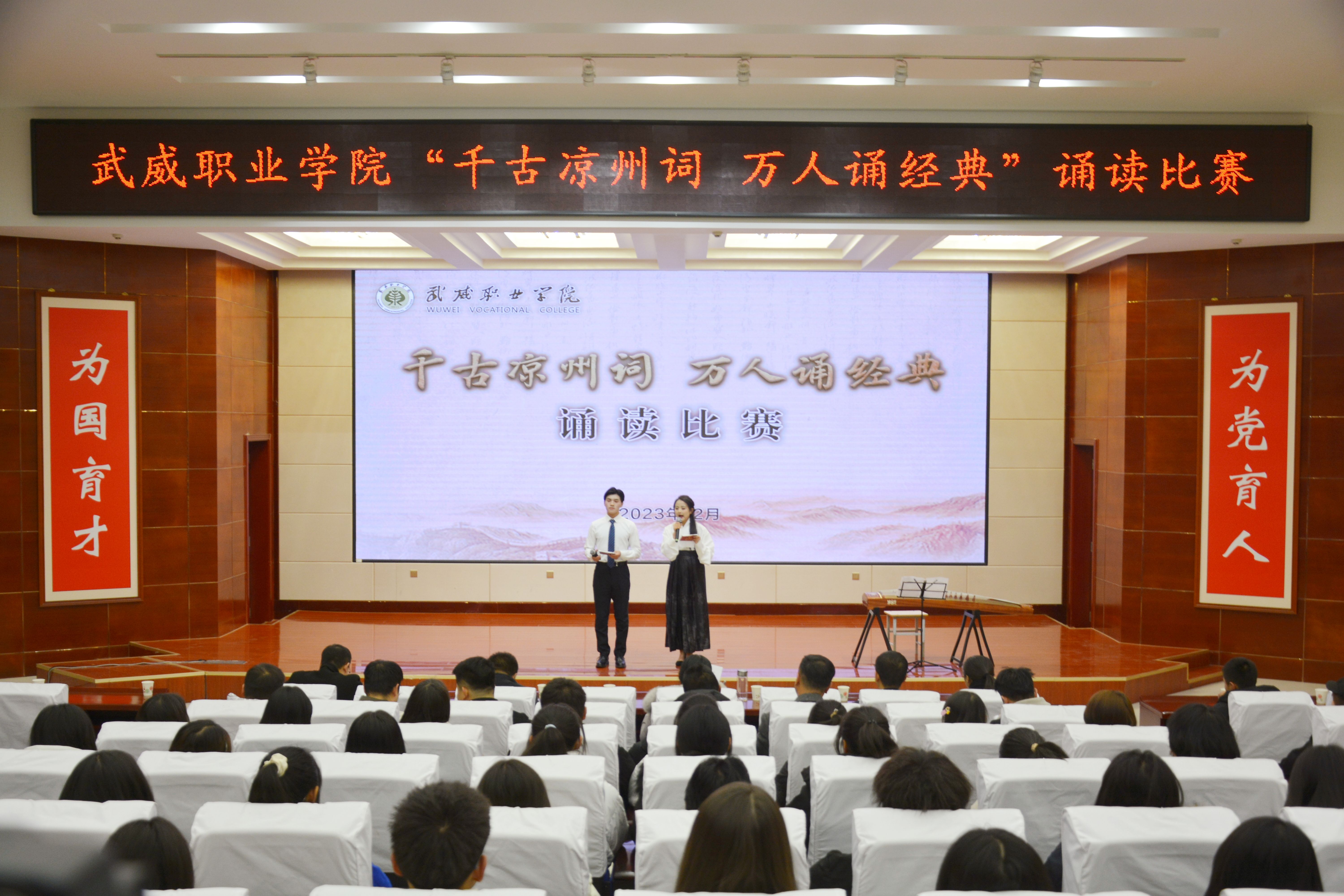 比賽現(xiàn)場精彩紛呈,現(xiàn)場氣氛異常熱烈,掌聲此起彼伏。節(jié)目以詩歌吟誦、伴舞、書法、國畫、武術(shù)、情景表演等豐富多彩的藝術(shù)形式,為現(xiàn)場觀眾打造出一場別開生面的涼州文化視聽盛宴。同學(xué)們激情洋溢,用澎湃真摯的情感演繹著經(jīng)典燦爛的磅礴詩篇,用跨越千年的對話勾勒出雄渾壯烈的漢武雄風(fēng),用鏗鏘有力的旋律編織出蕩氣回腸的時代頌歌,以青春奮斗的初心賡續(xù)著生生不息的五涼文化。