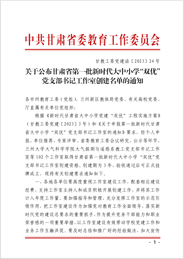 近日,中共甘肅省委教育工作委員會公布了《關(guān)于公布甘肅省第一批新時代大中小學(xué)“雙優(yōu)”黨支部書記工作室創(chuàng)建名單的通知》(甘教工委黨建函〔2023〕24號),全省高校32個黨支部書記工作室獲批創(chuàng)建資格,中科低碳新能源技術(shù)學(xué)院教師黨支部書記工作室(支部書記黃述杰教授)成功入選,獲得創(chuàng)建資格。