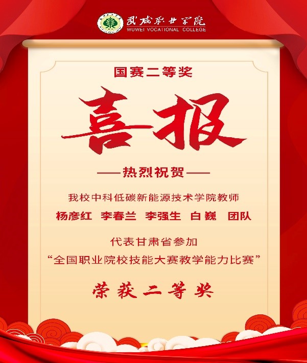 近日,2023年全國職業(yè)院校技能大賽教學(xué)能力比賽決賽在江西現(xiàn)代職業(yè)技術(shù)學(xué)院落下帷幕,由中科低碳新能源學(xué)院教師楊彥紅、李春蘭、李強生、白巍組成的參賽團隊作為甘肅省唯一一支打入國賽決賽的團隊,代表甘肅省參加比賽,喜獲專業(yè)課程高職一組二等獎。