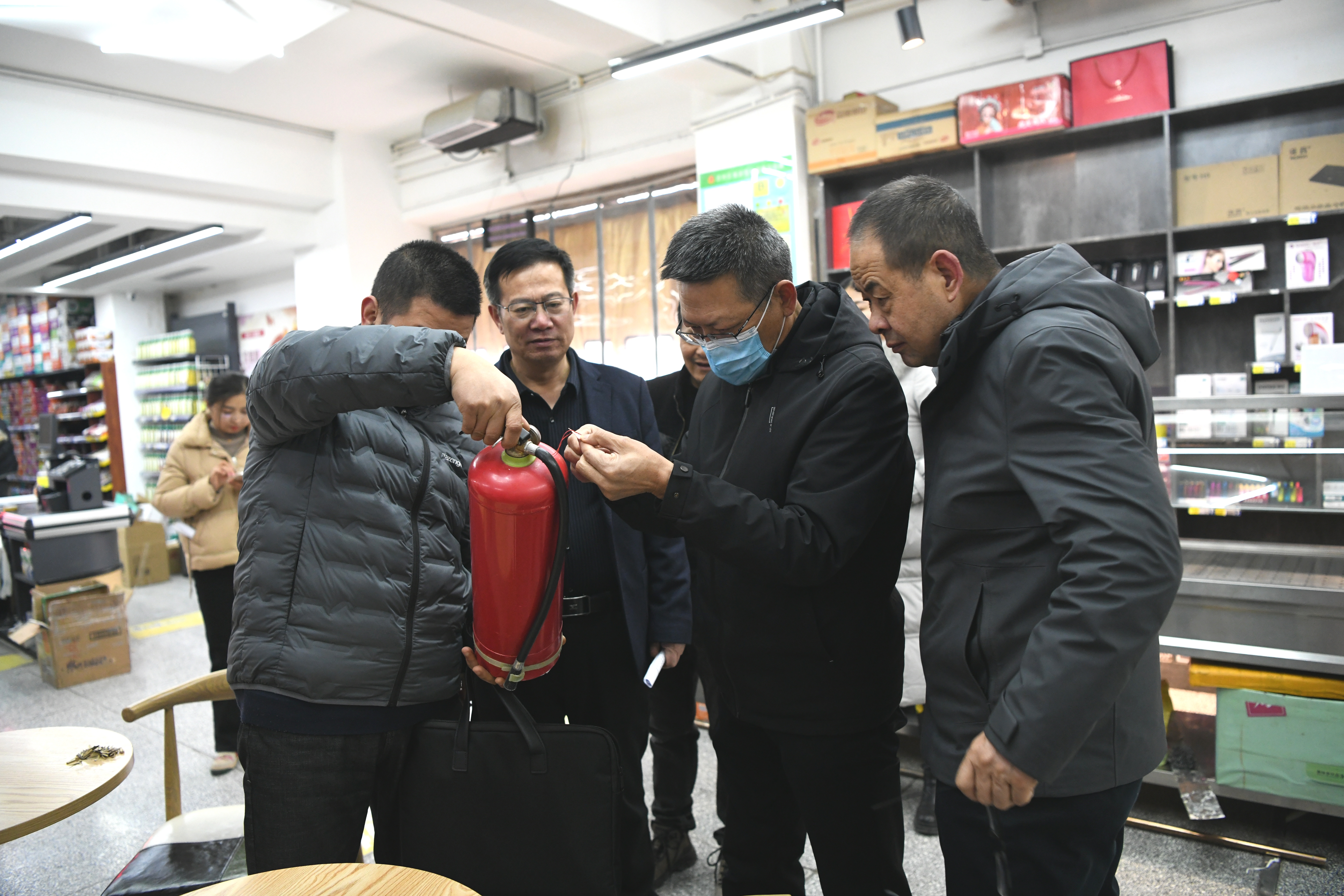 在實驗實訓室內(nèi),督察組詢問設(shè)施設(shè)備準備情況,逐一檢查實訓場地內(nèi)消防安全設(shè)施配備情況。
