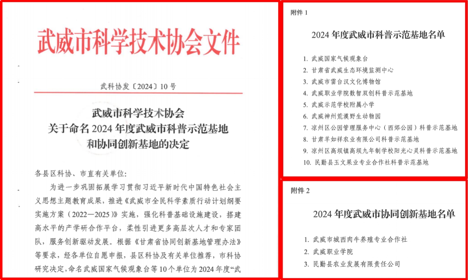 近日,武威市科學技術(shù)協(xié)會發(fā)布《關(guān)于命名2024年武威市科普基地和協(xié)同創(chuàng)新基地的通知》,學校獲批武威職業(yè)學院數(shù)智雙創(chuàng)科普示范基地和武威市協(xié)同創(chuàng)新基地。