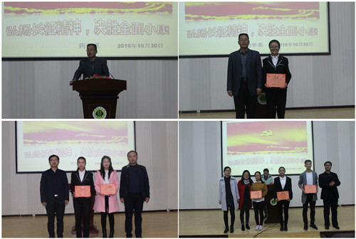 為紀(jì)念紅軍長征勝利80周年,激發(fā)師生弘揚(yáng)偉大的長征精神,同時為豐富校園文化生活,展示青春正能量,藥學(xué)系團(tuán)總支依據(jù)院團(tuán)委的通知精神和系團(tuán)學(xué)工作委員會關(guān)于增加學(xué)生課余活動的會議要求,于10月30日在正德廳組織開展了“傳承長征精神,筑我青春夢想”主題演講比賽。藥學(xué)系主任魏潤明出席了本次活動,各班班主任擔(dān)任本次比賽評委,2016級全體學(xué)生和2015級各班學(xué)生代表觀看了比賽。