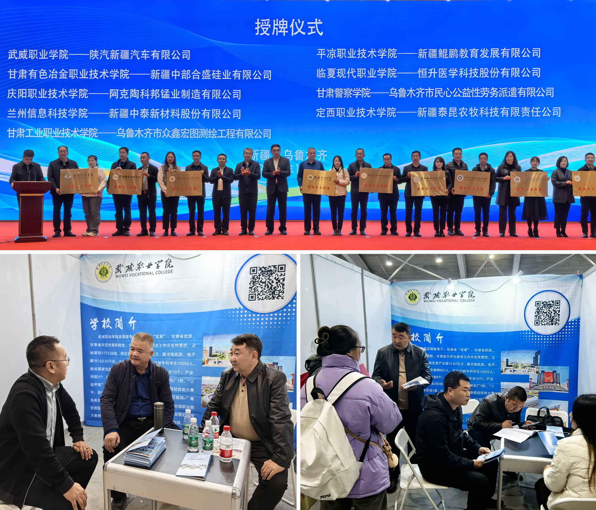 11月1日,召開了甘肅省2025屆畢業(yè)生推介會(huì)暨供需對(duì)接“政校企”合作座談會(huì)、甘青新蒙四省(區(qū))八市(州盟)“紅石榴促就業(yè)”訪企拓崗座談會(huì),30余家企事業(yè)單位與學(xué)校就人才招聘、校企合作等方面的內(nèi)容進(jìn)行了深入交流。在“政校企”合作座談會(huì)上,王守云為陜汽新疆汽車有限公司授予武威職業(yè)學(xué)院實(shí)習(xí)就業(yè)基地牌匾。