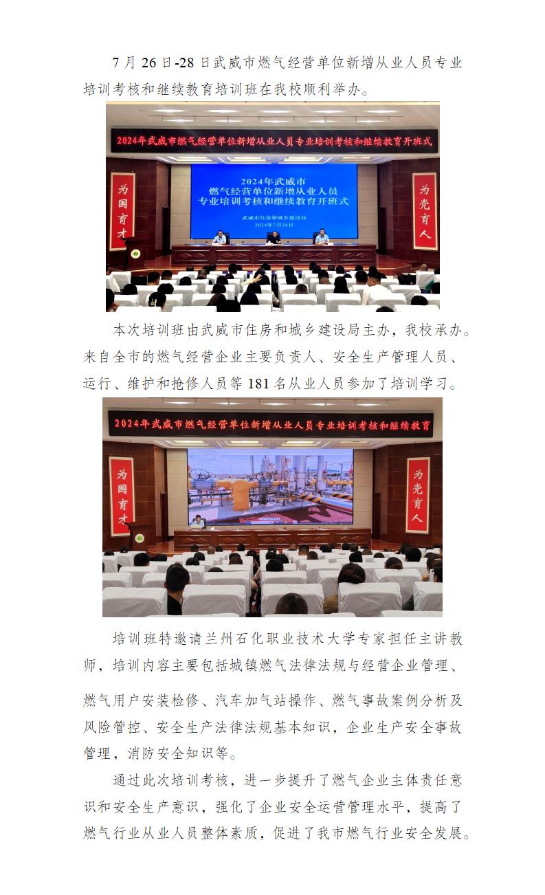 2024年武威市燃氣經(jīng)營單位新增從業(yè)人員專業(yè)培訓考核和繼續(xù)教育培訓班在我校成功舉辦