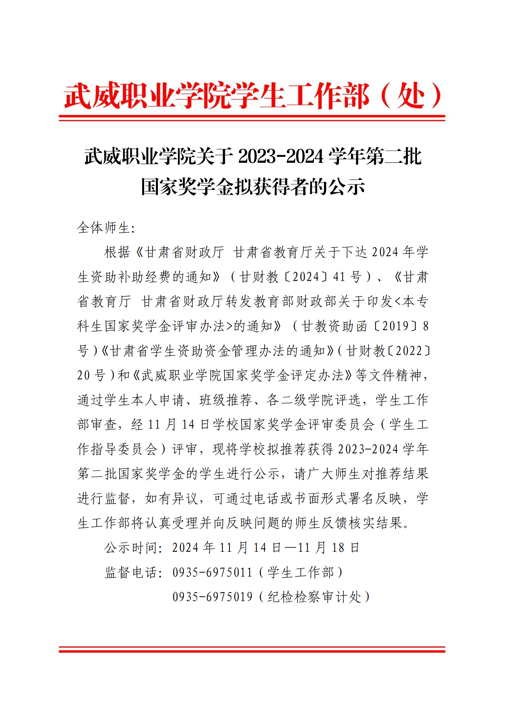 武威職業(yè)學(xué)院關(guān)于2023-2024學(xué)年第二批國家獎(jiǎng)學(xué)金擬獲得者的公示