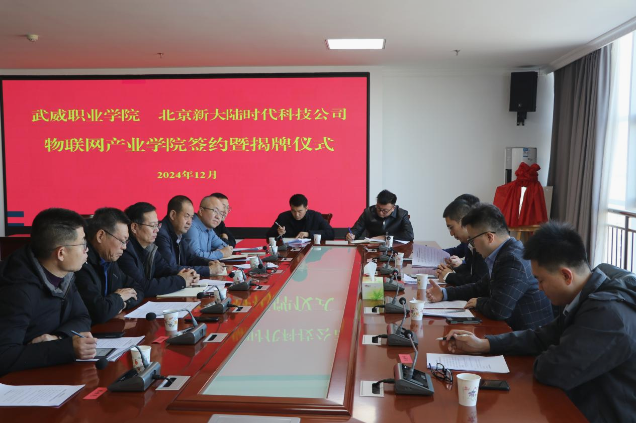 為全面深化產(chǎn)教融合,加強校企合作,進一步提高我校人才培養(yǎng)質(zhì)量。12月3日,學(xué)校在能源科技樓811會議室舉行武威職業(yè)學(xué)院和北京新大陸時代科技公司物聯(lián)網(wǎng)產(chǎn)業(yè)學(xué)院簽約暨揭牌儀式。北京新大陸時代科技公司西北區(qū)總監(jiān)劉寧、技術(shù)總監(jiān)樊斌,相關(guān)業(yè)務(wù)部門負(fù)責(zé)人,學(xué)校校長、黨委副書記張開禮、黨委副書記翟存祥、相關(guān)部門負(fù)責(zé)人及教師代表參加活動。黨委委員、副校長王永緒主持儀式。