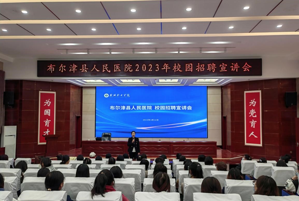 李娟介紹了布爾津縣人民醫(yī)院的基本情況、發(fā)展思路和人才需求,表達(dá)了對此次合作的美好祝愿。王守云對李娟一行來校現(xiàn)場簽約表示了歡迎,也對布爾津縣人民醫(yī)院近年的發(fā)展成果給予了高度評價(jià)。雙方表示,希望今后在學(xué)生實(shí)習(xí)實(shí)訓(xùn)、人才培養(yǎng)質(zhì)量、畢業(yè)生實(shí)習(xí)就業(yè)、教師職業(yè)能力提升等方面加強(qiáng)合作,拓寬合作范圍。簽約儀式結(jié)束后,布爾津縣人民醫(yī)院在學(xué)生發(fā)展中心舉行了校園招聘宣講活動(dòng),約200名師生參加,部分學(xué)生現(xiàn)場達(dá)成實(shí)習(xí)就業(yè)意向。