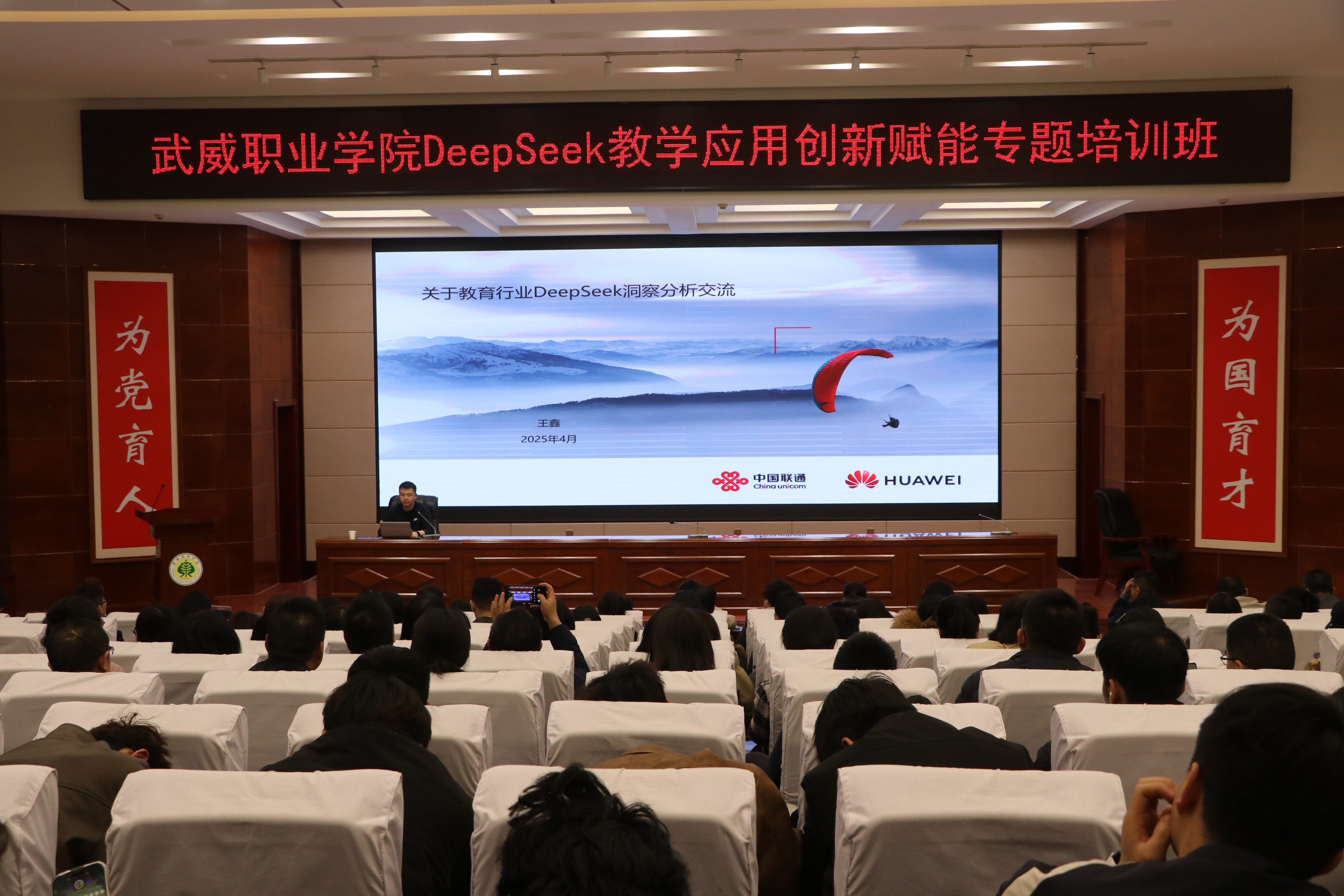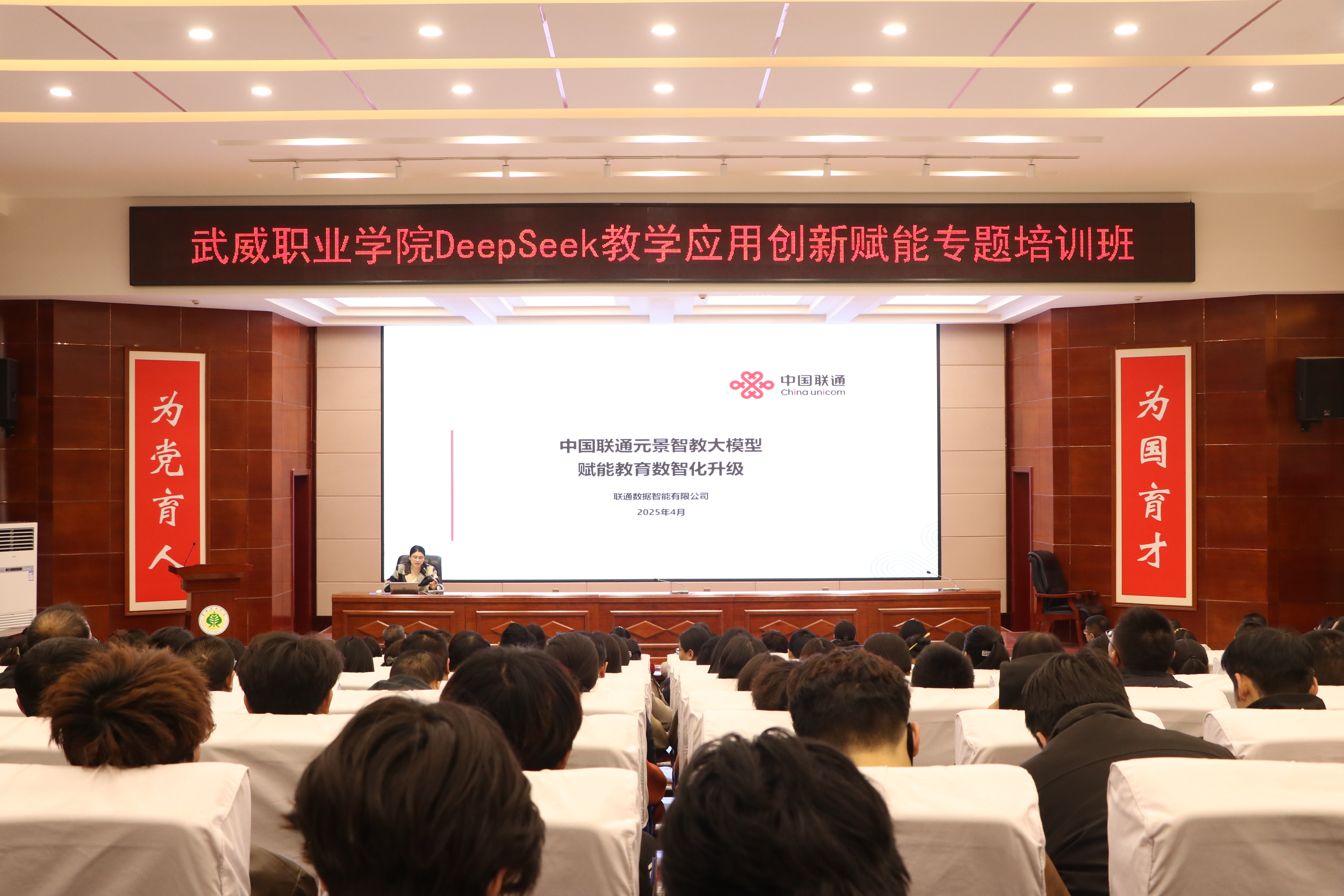 為深入探討DeepSeek技術(shù)的應(yīng)用,助力學(xué)校師生運(yùn)用AI工具進(jìn)行教學(xué)實(shí)踐、智慧課程建設(shè)與科學(xué)研究工作,為教學(xué)改革與教學(xué)創(chuàng)新實(shí)踐筑基賦能。4月3日,學(xué)校邀請聯(lián)通數(shù)據(jù)智能有限公司教育行業(yè)解決方案專家包紅梅和華為技術(shù)有限公司智算產(chǎn)業(yè)AI架構(gòu)師王鑫,舉辦了“DeepSeek教學(xué)應(yīng)用創(chuàng)新賦能”專題講座。講座由網(wǎng)絡(luò)安全與信息技術(shù)中心負(fù)責(zé)人史子新主持,學(xué)校各部門、二級學(xué)院教師代表,信息技術(shù)學(xué)院學(xué)生代表共計220人參加。