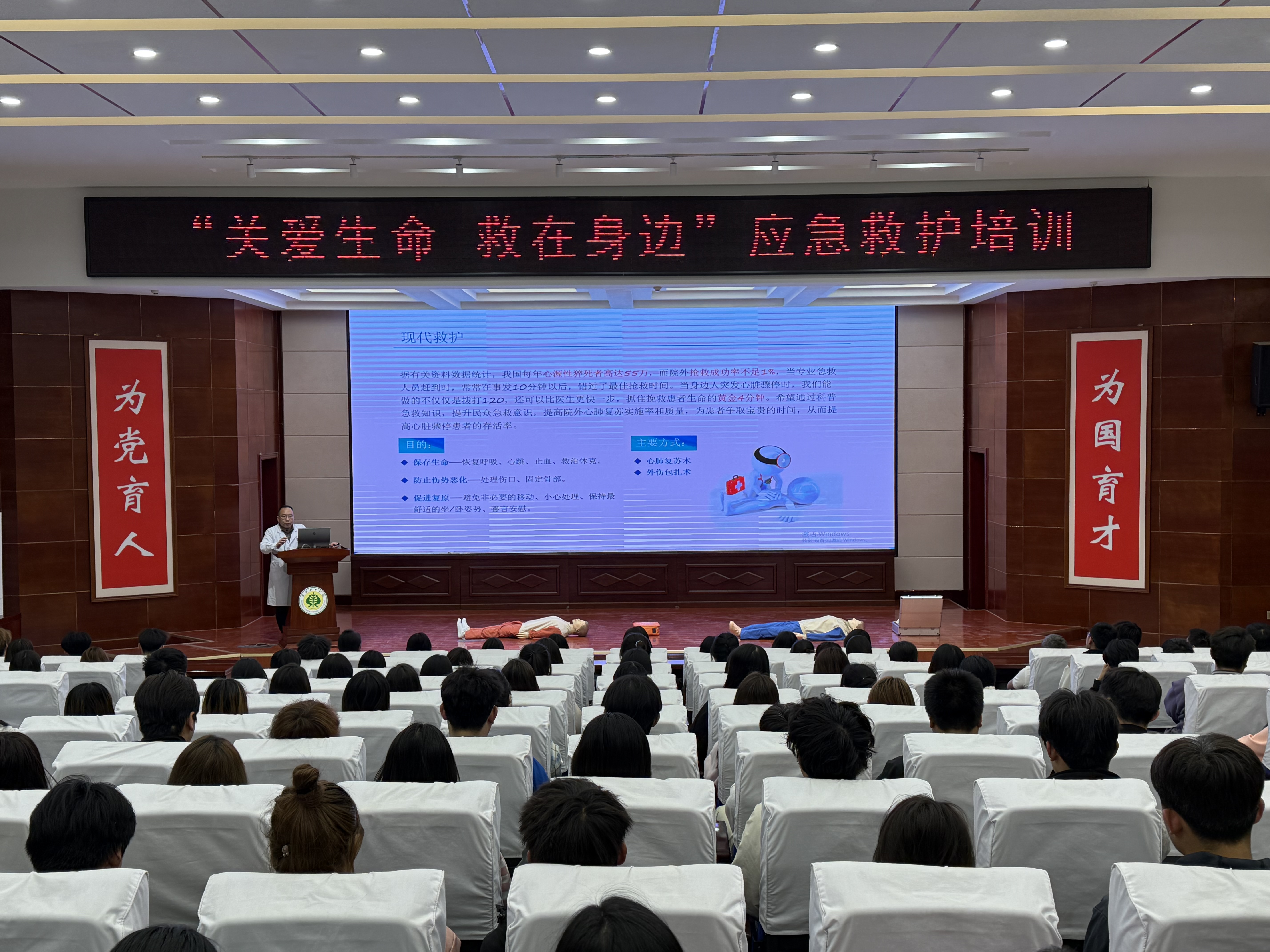 在理論環(huán)節(jié),武威市人民醫(yī)院急診科劉主任圍繞現(xiàn)代救護(hù)理念展開講解,重點(diǎn)強(qiáng)調(diào)“黃金4分鐘”在心肺復(fù)蘇中的關(guān)鍵作用,并詳細(xì)解讀心肺復(fù)蘇(CPR)操作流程、AED使用規(guī)范、海姆立克急救法及創(chuàng)傷救護(hù)技術(shù)。結(jié)合真實(shí)案例,劉主任糾正了“掐人中急救”“盲目搬動(dòng)傷者”等常見誤區(qū),通過視頻演示和互動(dòng)問答,幫助同學(xué)們掌握科學(xué)施救要點(diǎn)?!凹本仁敲總€(gè)公民的社會(huì)責(zé)任,關(guān)鍵時(shí)刻能挽救生命?!眲⒅魅蔚闹v解深入淺出,現(xiàn)場學(xué)生認(rèn)真記錄,積極提問。?