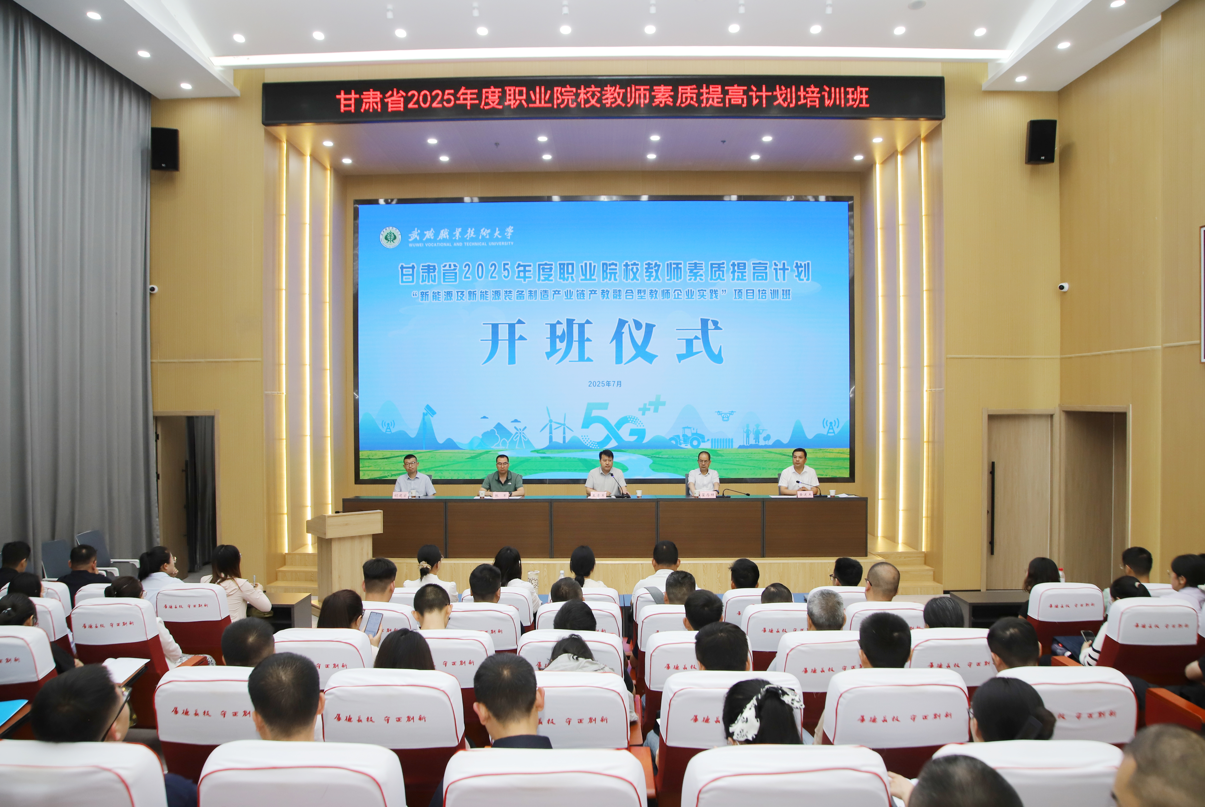 7月21日,由甘肅省教育廳主辦,武威職業(yè)技術(shù)大學(xué)首次承辦的甘肅省2025年度職業(yè)院校教師素質(zhì)提高計劃“新能源及新能源裝備制造產(chǎn)業(yè)鏈產(chǎn)教融合型教師企業(yè)實踐”項目培訓(xùn)班在學(xué)校順利開班,培訓(xùn)旨在提升教師產(chǎn)教融合、實踐教學(xué)、技術(shù)創(chuàng)新與服務(wù)的意識和能力,為甘肅省職業(yè)院校新時代高素質(zhì)專業(yè)化教師隊伍建設(shè)提供有力支撐。黨委副書記翟存祥,甘肅省職業(yè)院校教師素質(zhì)提高計劃管理辦公室負(fù)責(zé)人及專家出席開班儀式,來自全省16所職業(yè)技術(shù)大學(xué)(學(xué)院)的120名骨干教師參加培訓(xùn)。中科低碳新能源技術(shù)學(xué)院院長黃述杰主持開班儀式。