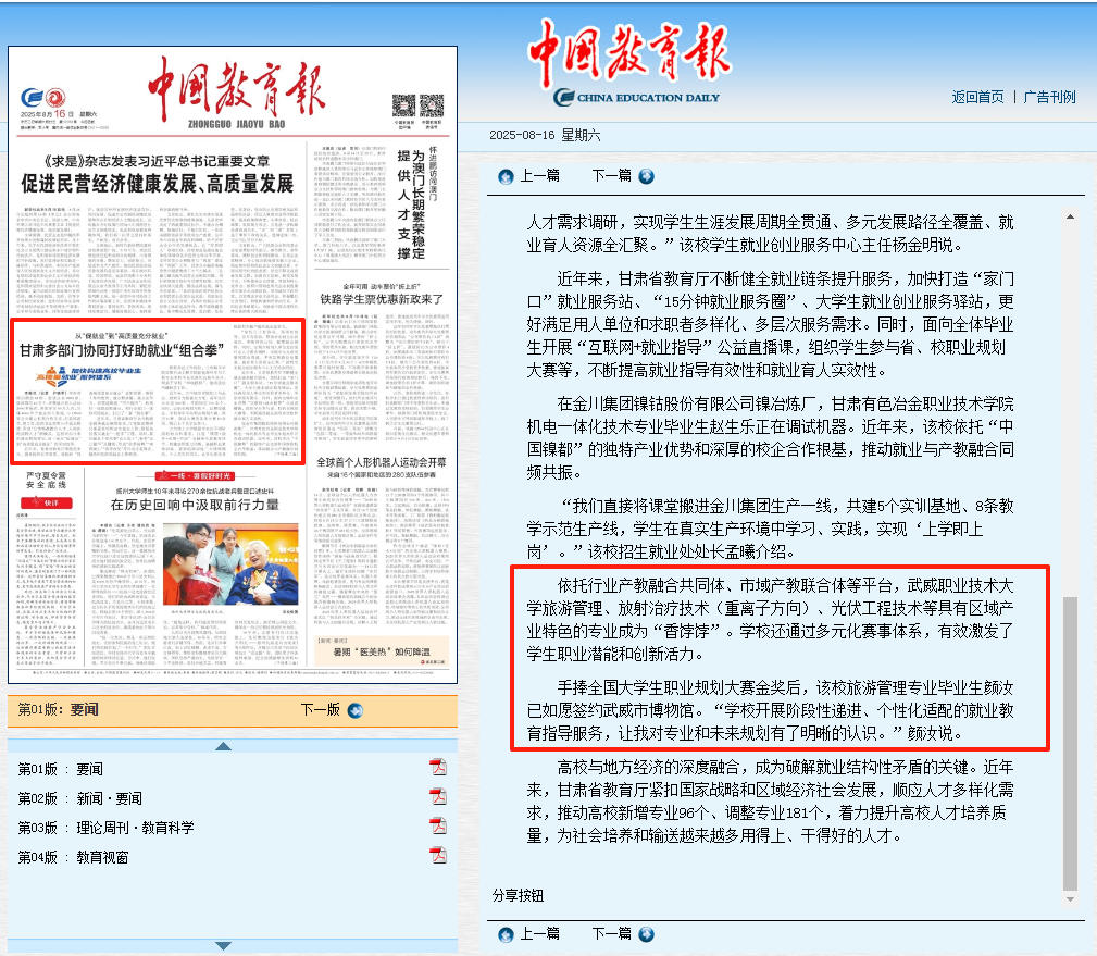 8月16日,《中國教育報(bào)》要聞版刊發(fā)“從‘促就業(yè)’到‘高質(zhì)量充分就業(yè)’甘肅多部門協(xié)同打好助就業(yè)‘組合拳’”的專題報(bào)道,報(bào)道了我校深化產(chǎn)教融合,賦能高質(zhì)量充分就業(yè)的創(chuàng)新實(shí)踐案例。