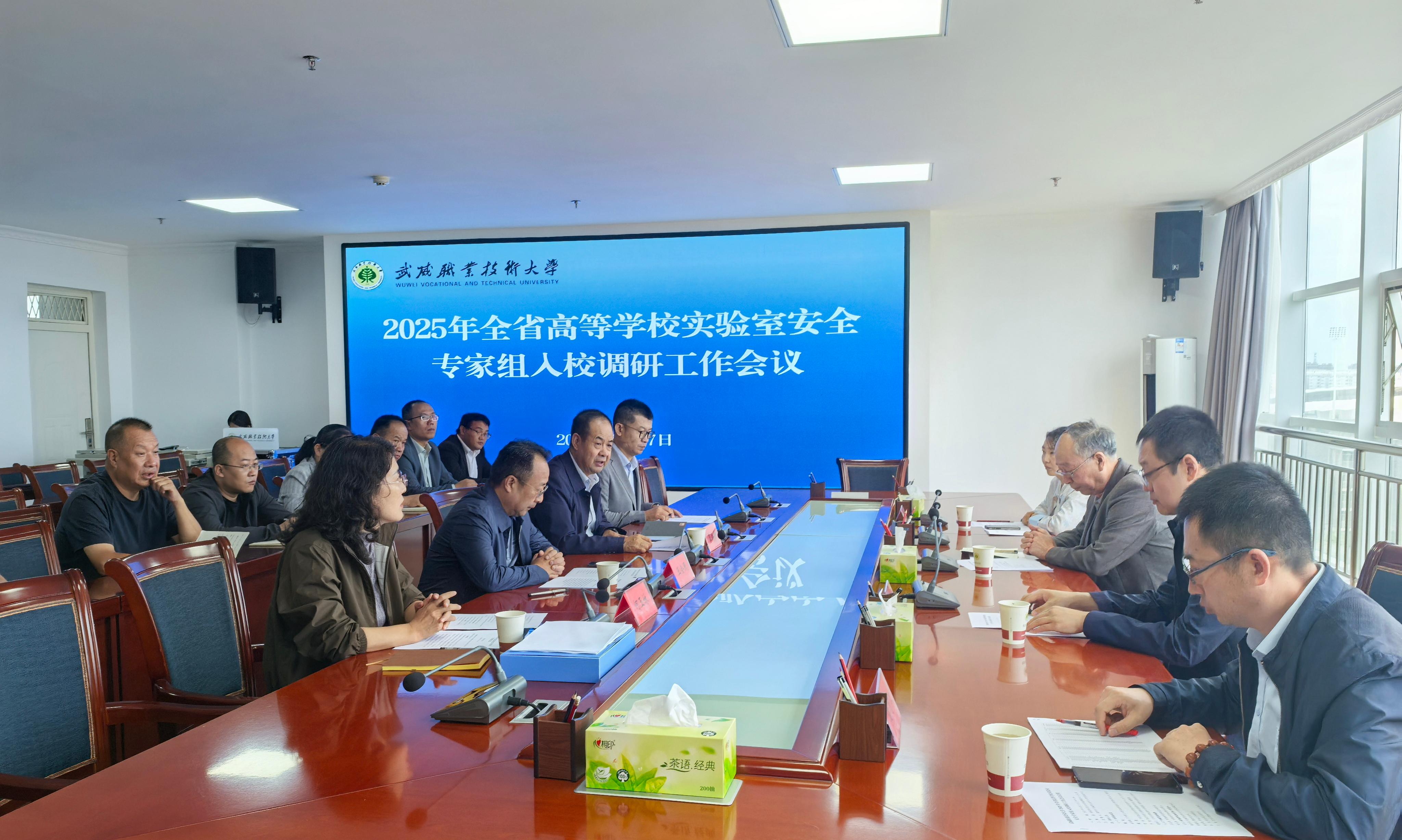 根據(jù)《甘肅省教育廳關(guān)于組織開展2025年高等學(xué)校實(shí)驗(yàn)室安全工作的通知》要求和安排部署,8月27日,省教育廳高校實(shí)驗(yàn)室安全調(diào)研專家組一行蒞臨學(xué)校開展實(shí)驗(yàn)室安全工作調(diào)研。武威市教育局副局長王會民、學(xué)校黨委副書記翟存祥、相關(guān)部門及學(xué)院(部)負(fù)責(zé)人參加會議。