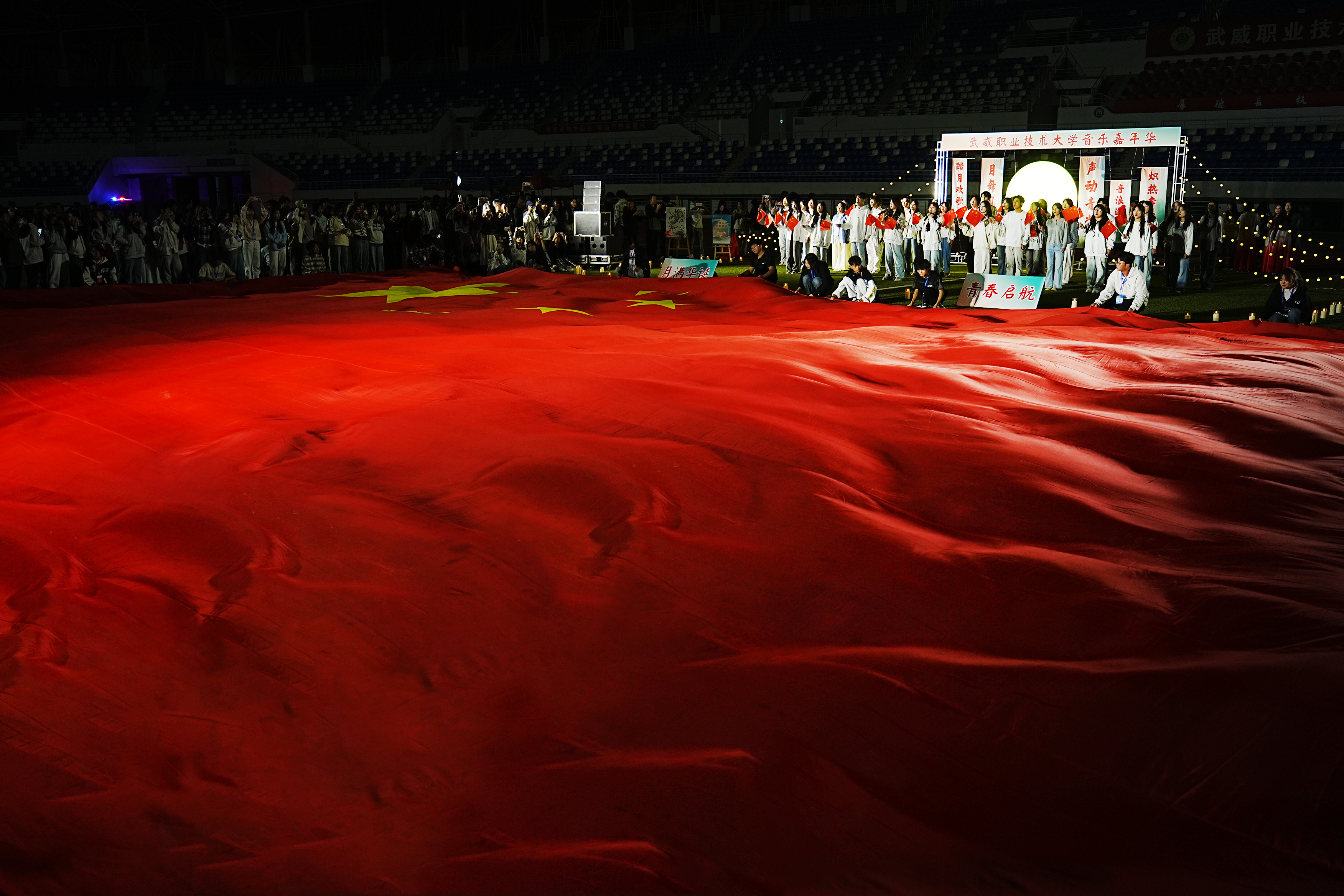 活動(dòng)尾聲,在深情的旋律中,演職人員與觀眾齊聲合唱《如愿》,深切表達(dá)對(duì)國(guó)泰民安的美好祝愿。巨幅國(guó)旗在師生手中緩緩傳遞、飄揚(yáng)舞動(dòng),匯成一片莊嚴(yán)而溫暖的紅色海洋,將現(xiàn)場(chǎng)氛圍推向最高潮,展現(xiàn)出青年一代與時(shí)代同頻、與祖國(guó)同行的堅(jiān)定信念。