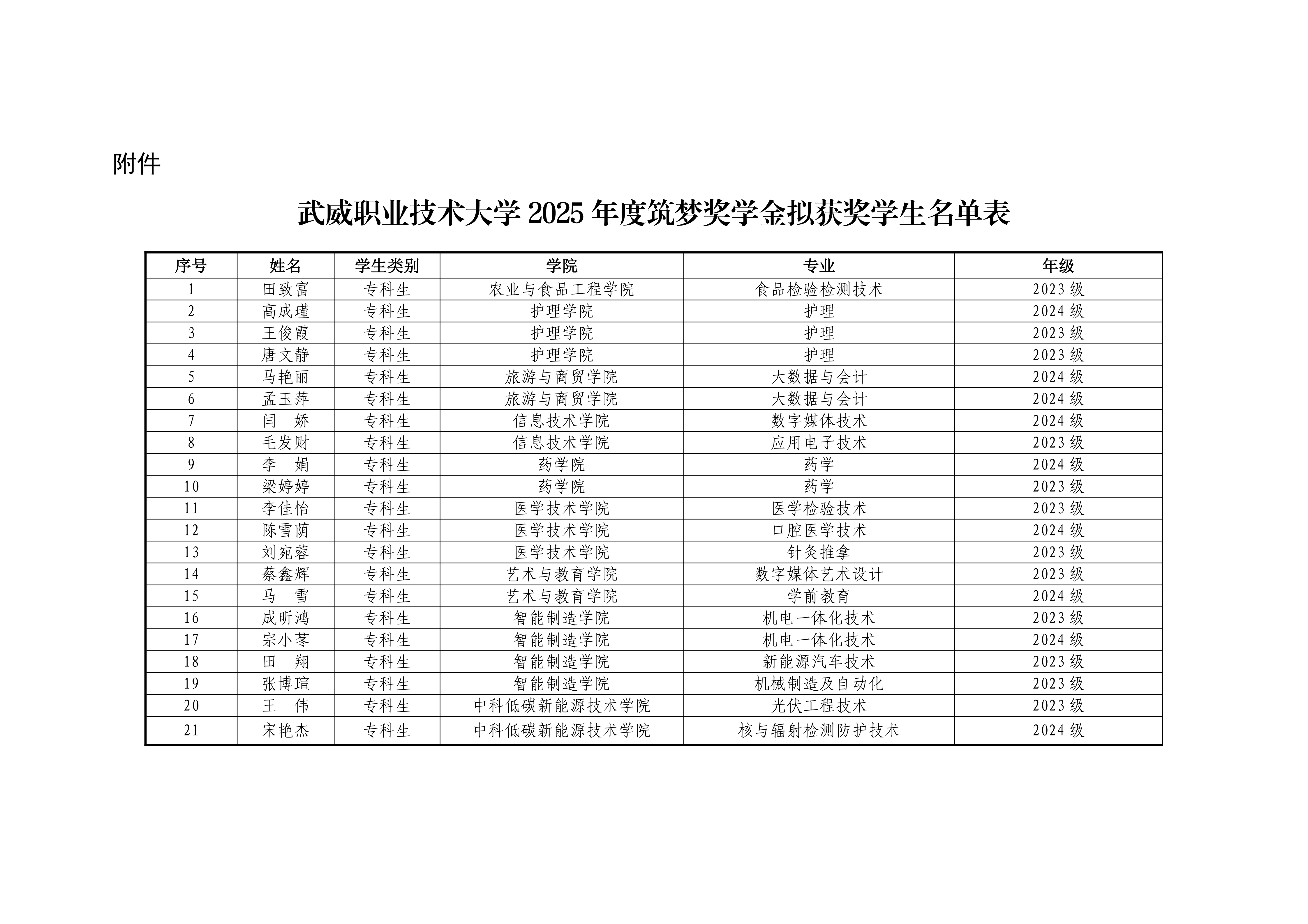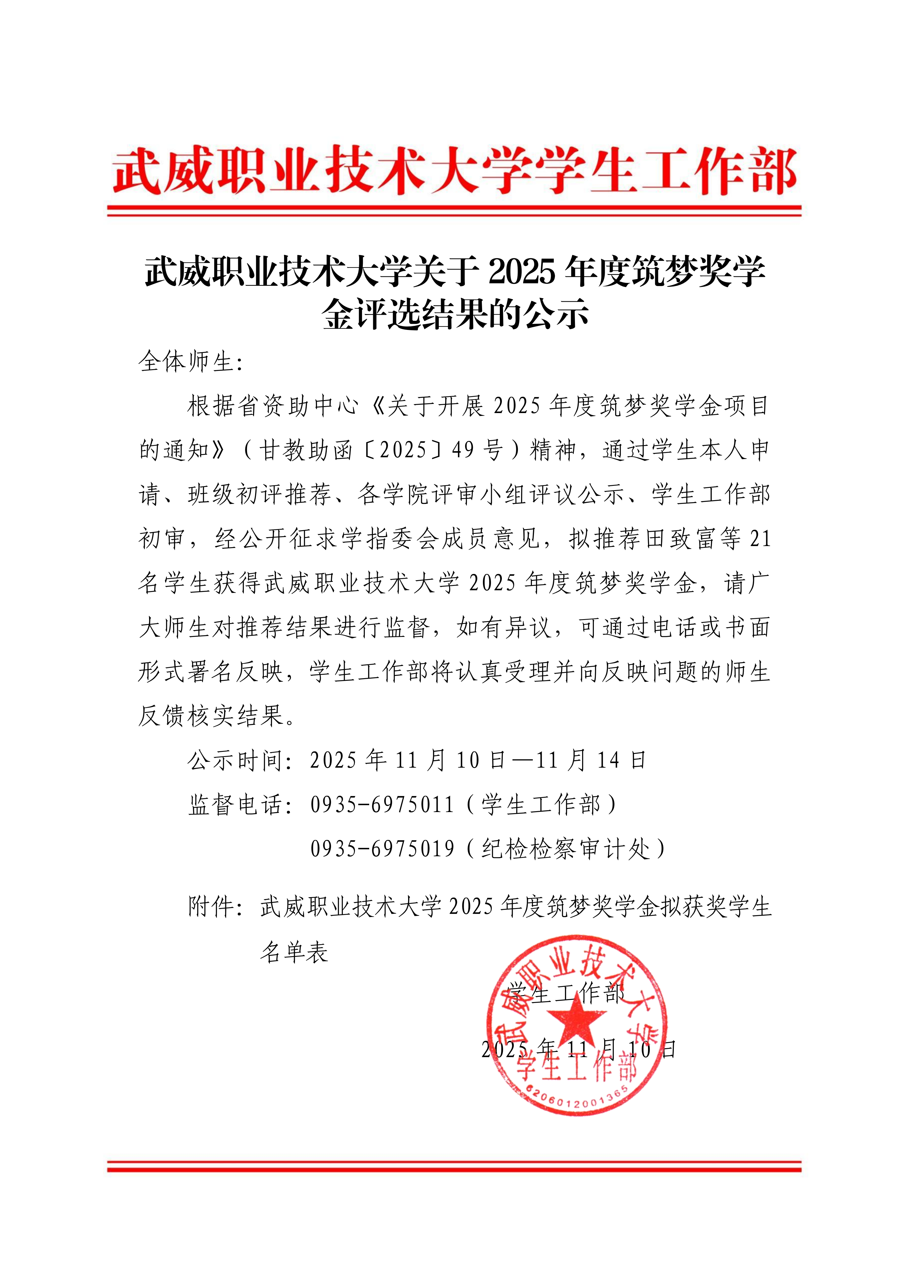 武威職業(yè)技術(shù)大學(xué)關(guān)于2025年度筑夢獎(jiǎng)學(xué)金評(píng)選結(jié)果的公示