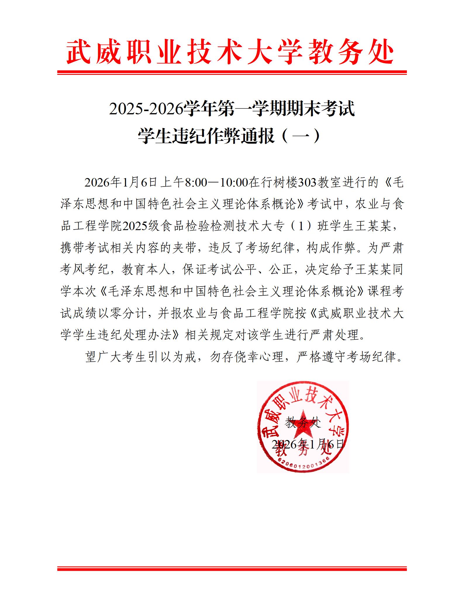 2025-2026學年第一學期期末考試學生違紀作弊通報(一)