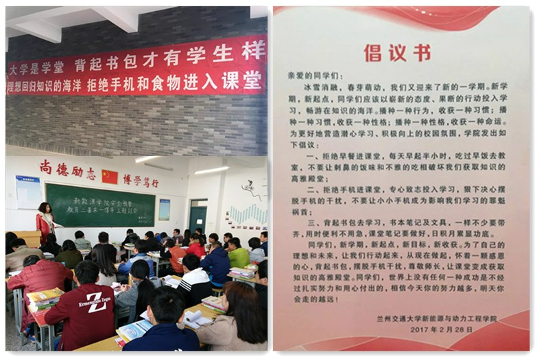 新學(xué)期伊始,新能源學(xué)院要求所有班主任及輔導(dǎo)員老師除了做好學(xué)生課堂管理工作、宿舍安全衛(wèi)生工作、密切關(guān)注“三困生”等常規(guī)工作之外,重點部署了安全預(yù)警教育和“三要求一倡導(dǎo)”教育活動,即要求學(xué)生上課必須關(guān)閉手機(jī)、不得將食品帶入課堂、不準(zhǔn)在公共場所吸煙,倡導(dǎo)學(xué)生背書包。