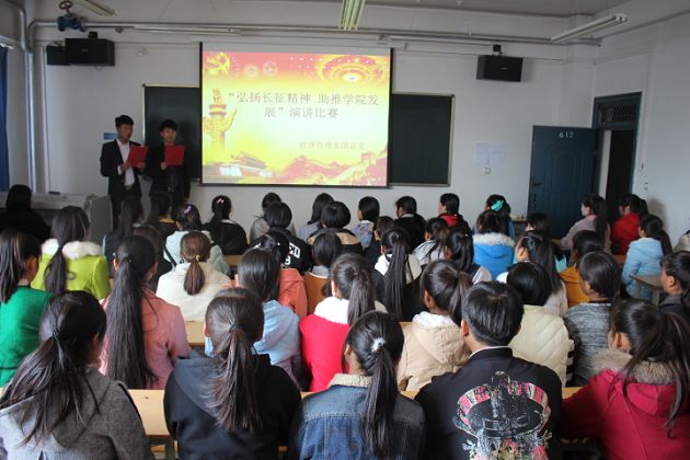 10月25日、26日組織學(xué)生觀看大型紀(jì)錄片《長征》,通過了解紅軍長征勝利的歷史故事,體會紅軍長征精神,抒發(fā)對革命先烈的敬仰之情,在感人的故事中回顧革命歷史,感恩幸福生活。10月31日晚,在博學(xué)樓612舉行了以“弘揚長征精神、助推學(xué)院發(fā)展”為主題的演講比賽。通過不同形式的活動,號召同學(xué)們弘揚長征精神,從小做起,從一點一滴做起,為中華民族的復(fù)興而努力學(xué)習(xí),讓紅軍精神在莘莘學(xué)子中傳承。