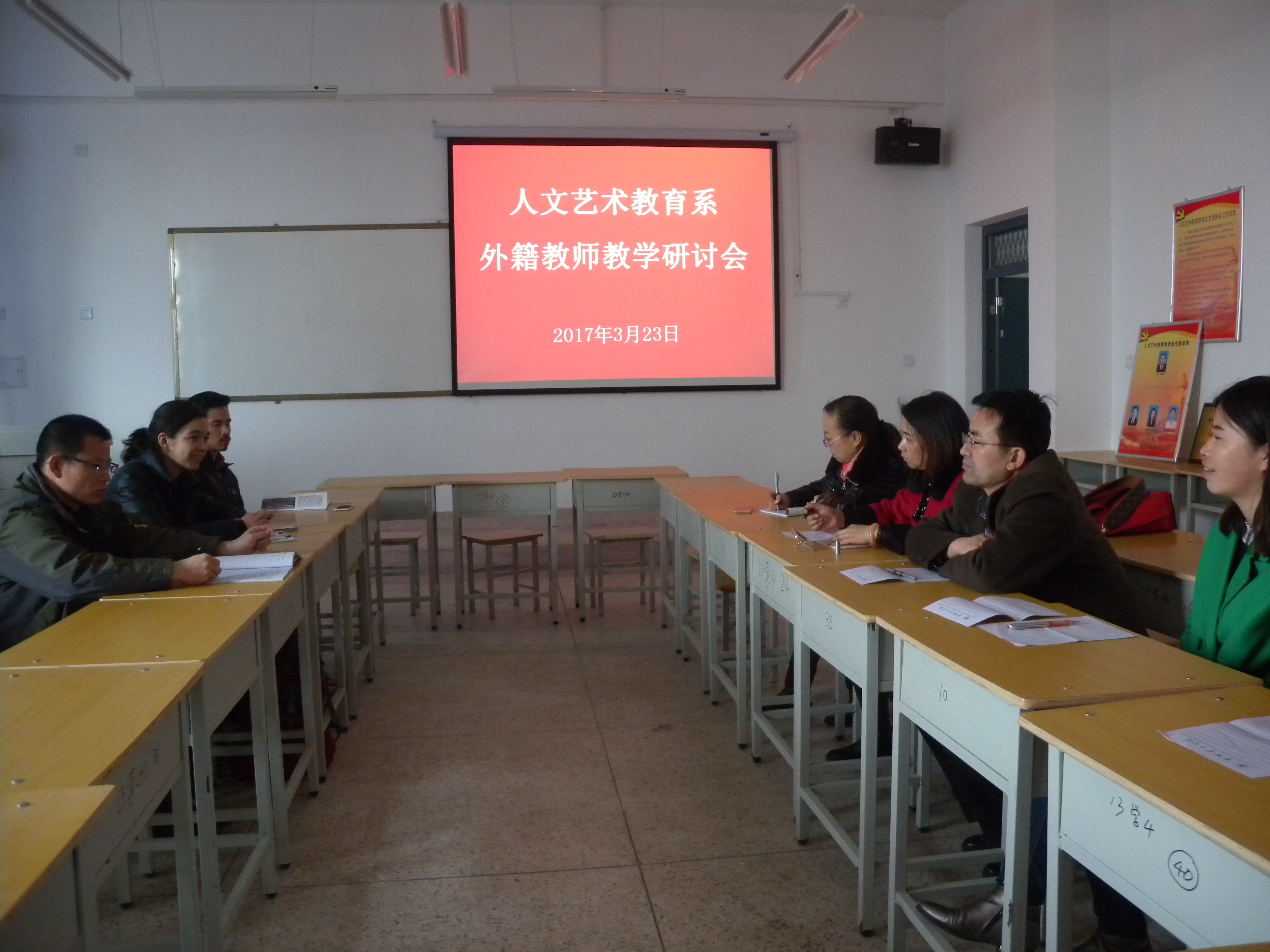 3月23日下午,人文藝術(shù)教育系在勵勤樓403教室召開了外籍教師教學(xué)研討會。會議由文英教研室主任趙金存老師主持,文英教研室全體英語老師、美中友好志愿者志愿教師MARIA(羅曼麗)和JUSTIN(王杰)及美中友好志愿者志管理人員臧百鵬老師參加了會議。