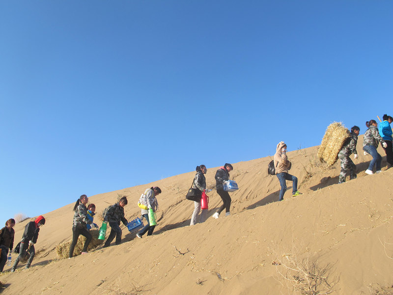 到達治沙造林現(xiàn)場后,師生按照劃分好的區(qū)域,在現(xiàn)場技術人員的指導下布線、挖坑、鋪草、壓沙等動作,齊心協(xié)力完成了預定的治沙造林任務。