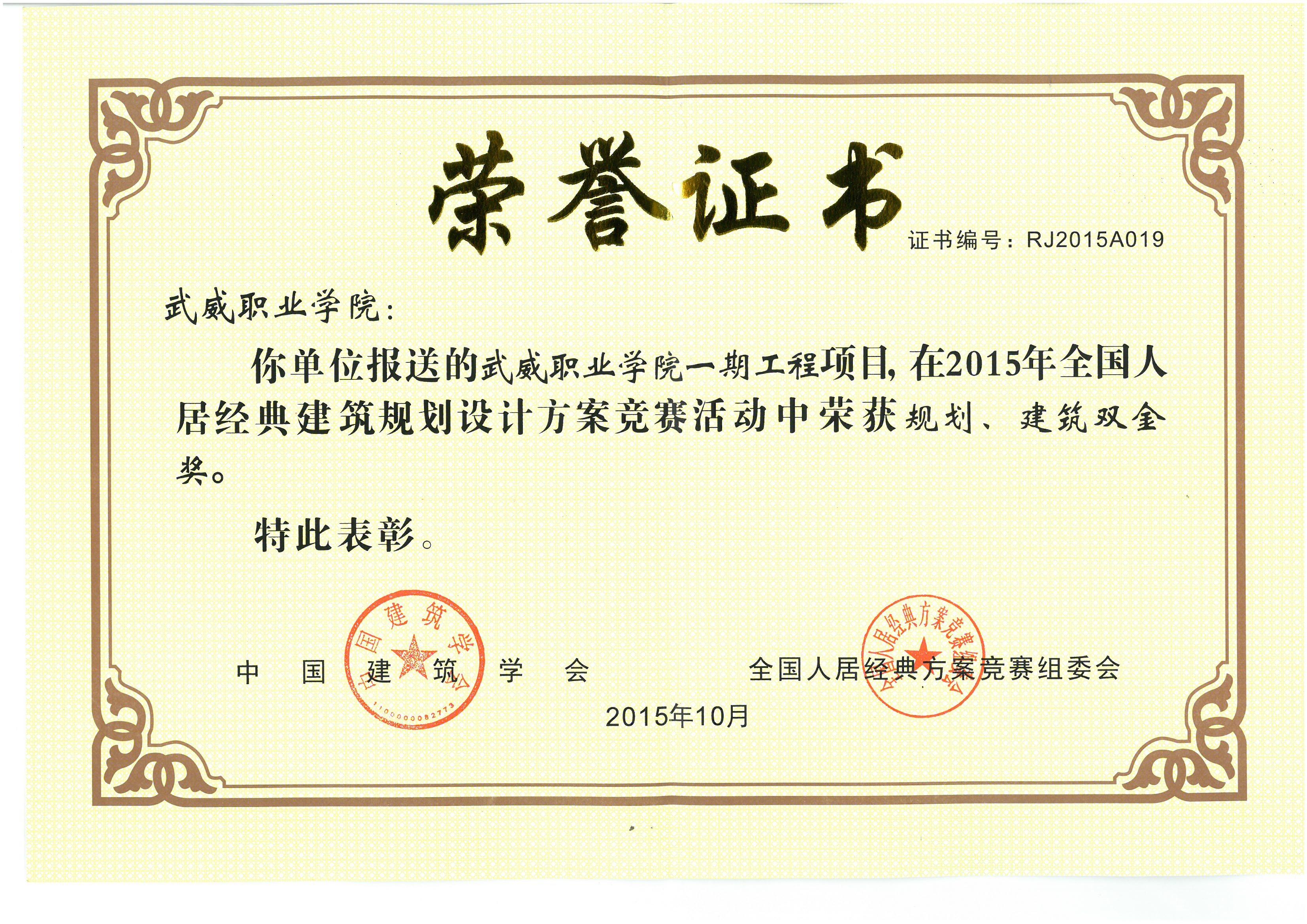 2015年10月,第十五屆全國(guó)人居經(jīng)典建筑規(guī)劃設(shè)計(jì)方案競(jìng)賽結(jié)果在北京揭曉,我院報(bào)送的武威職業(yè)學(xué)院一期擴(kuò)建項(xiàng)目在全國(guó)眾多參賽項(xiàng)目中脫穎而出,榮膺規(guī)劃、建筑雙金獎(jiǎng)。全國(guó)人居經(jīng)典方案競(jìng)賽由中國(guó)建筑學(xué)會(huì)主辦,全國(guó)人居經(jīng)典方案競(jìng)賽組委會(huì)承辦,自2001年起每年舉辦一屆,參賽項(xiàng)目覆蓋全國(guó)所有省份及港澳臺(tái)地區(qū),評(píng)審專(zhuān)家皆為業(yè)界權(quán)威,獲獎(jiǎng)難度大,權(quán)威性高。榮膺規(guī)劃、建筑雙金獎(jiǎng)是武威建筑項(xiàng)目上的首次。