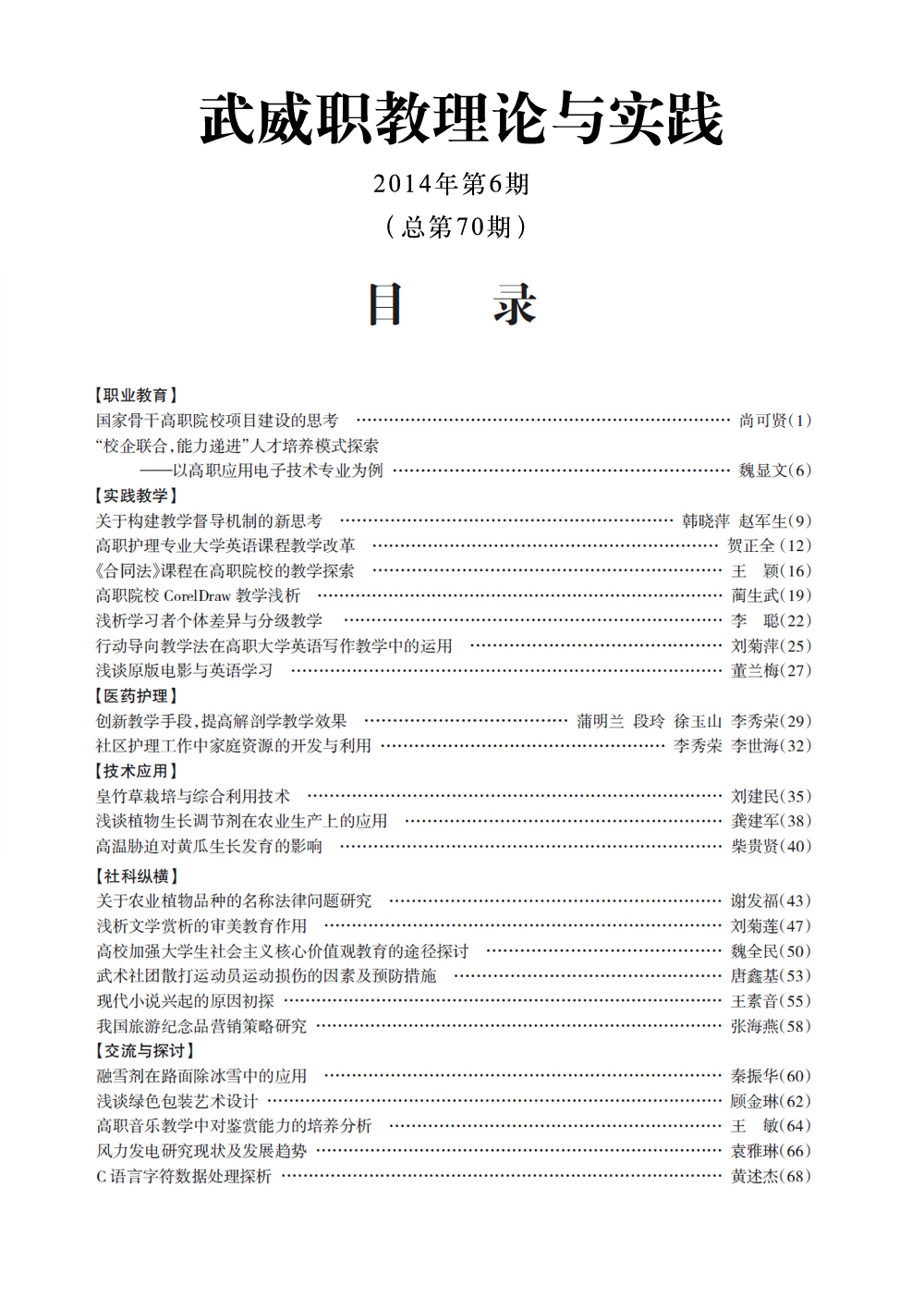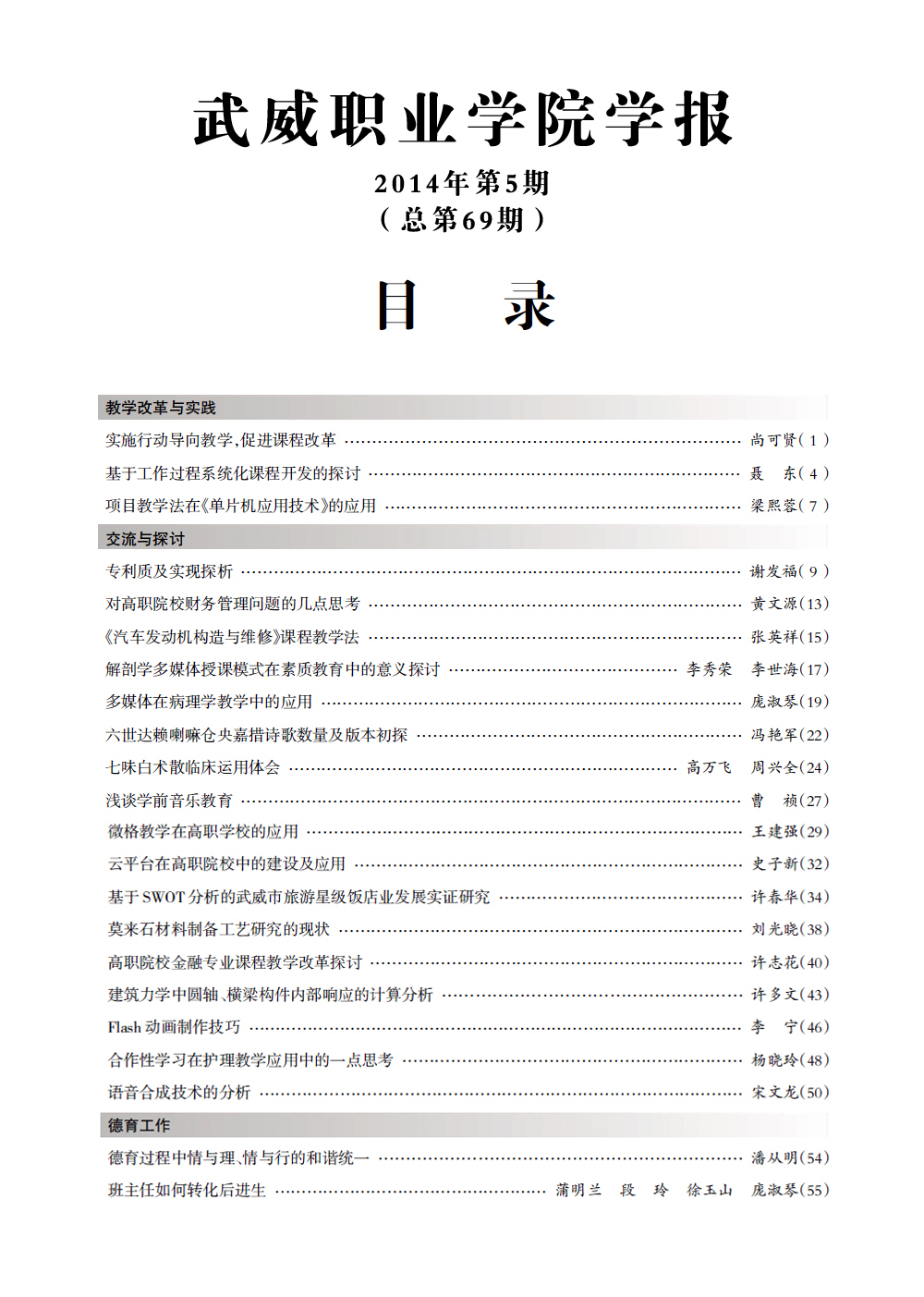 2014年《武威職業(yè)學院學報》目錄