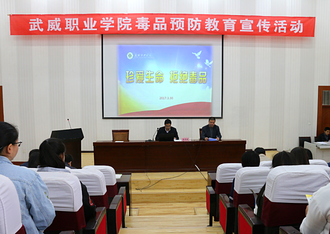 3月30日下午,院團(tuán)委聯(lián)合學(xué)生工作處、保衛(wèi)處在正德廳舉辦武威職業(yè)學(xué)院毒品預(yù)防教育宣傳活動(dòng),團(tuán)市委書記潘多民出席活動(dòng)并授課,學(xué)院各級(jí)團(tuán)干部270多人參加了活動(dòng)?;顒?dòng)由學(xué)生工作處處長(zhǎng)王守云主持。