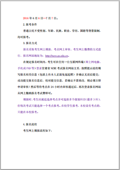 根據(jù)甘肅省教育考試院《關(guān)于做好2016年9月全國計算機等級考試網(wǎng)上報名工作的通知》(甘教考院〔2016〕95號文件)要求,2016年9月全國計算機等級考試(NCRE)將于2016年6月6日開始報名,全省統(tǒng)一實行網(wǎng)上報名。本次報名按照考生網(wǎng)上填報、考點網(wǎng)上審核、考生網(wǎng)上繳費的步驟進(jìn)行。現(xiàn)將有關(guān)安排及要求通知如下: