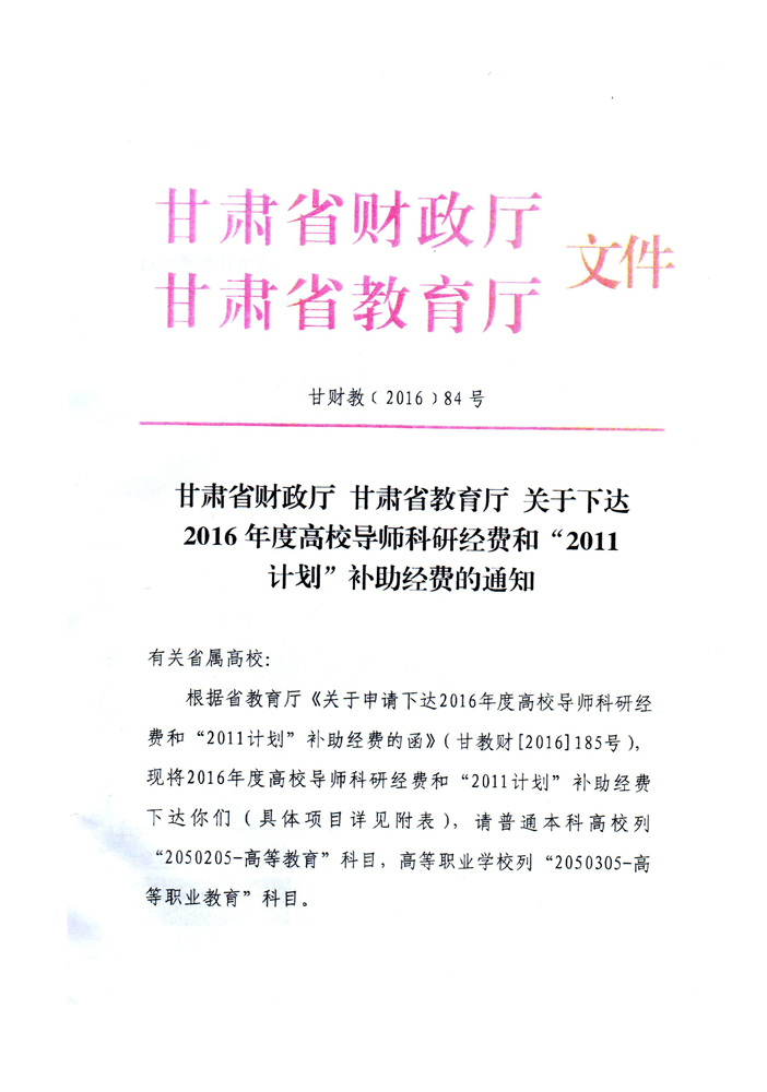 轉(zhuǎn)發(fā)甘肅省財(cái)政廳 教育廳文件 關(guān)于下達(dá)2016年度高校導(dǎo)師科研經(jīng)費(fèi)和“2011計(jì)劃”補(bǔ)助經(jīng)費(fèi)的通知