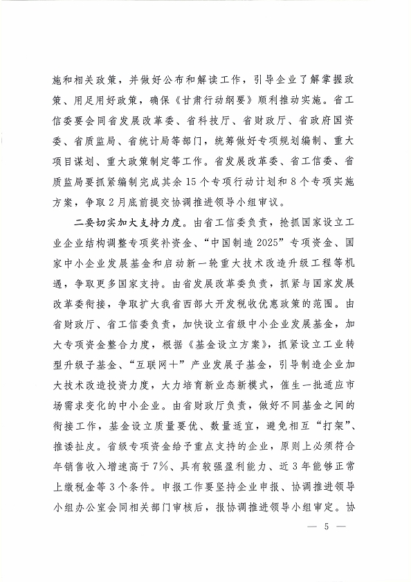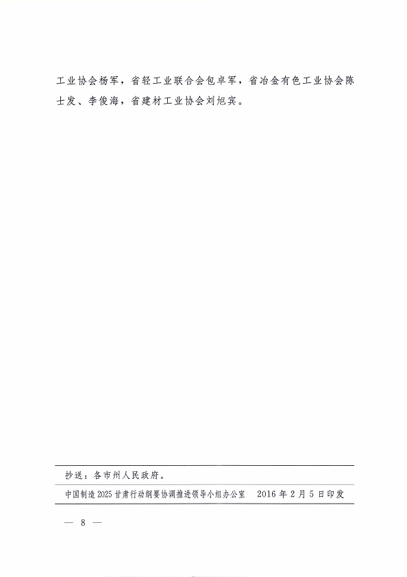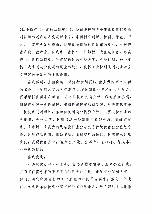 2016 年 1 月 30 日,省委副書記、省長、中國制造 2025甘肅行動綱要協(xié)調(diào)推進(jìn)領(lǐng)導(dǎo)小組組長劉偉平主持召開了協(xié)調(diào)推進(jìn)領(lǐng)導(dǎo)小組第一次會議,研究部署我省行動綱要的協(xié)調(diào)和推進(jìn)工作?,F(xiàn)將《中國制造 2025 甘肅行動綱要協(xié)調(diào)推進(jìn)領(lǐng)導(dǎo)小組第一次會議紀(jì)要》轉(zhuǎn)發(fā)你們。