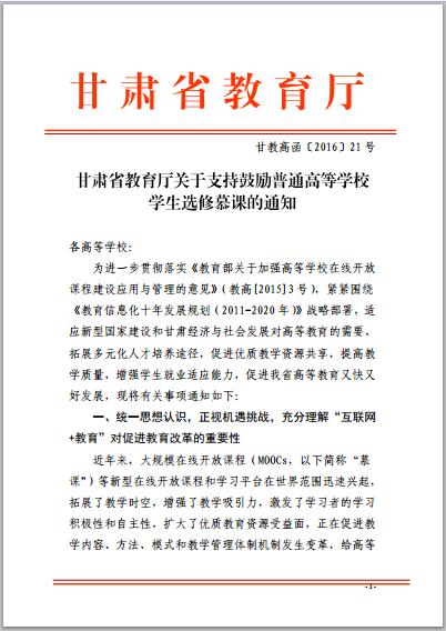 甘肅省教育廳關(guān)于支持鼓勵(lì)普通高等學(xué)校學(xué)生選修慕課的通知
