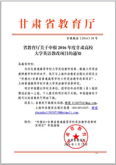 省教育廳關(guān)于申報(bào)2016年度甘肅高校大學(xué)英語教改項(xiàng)目的通知