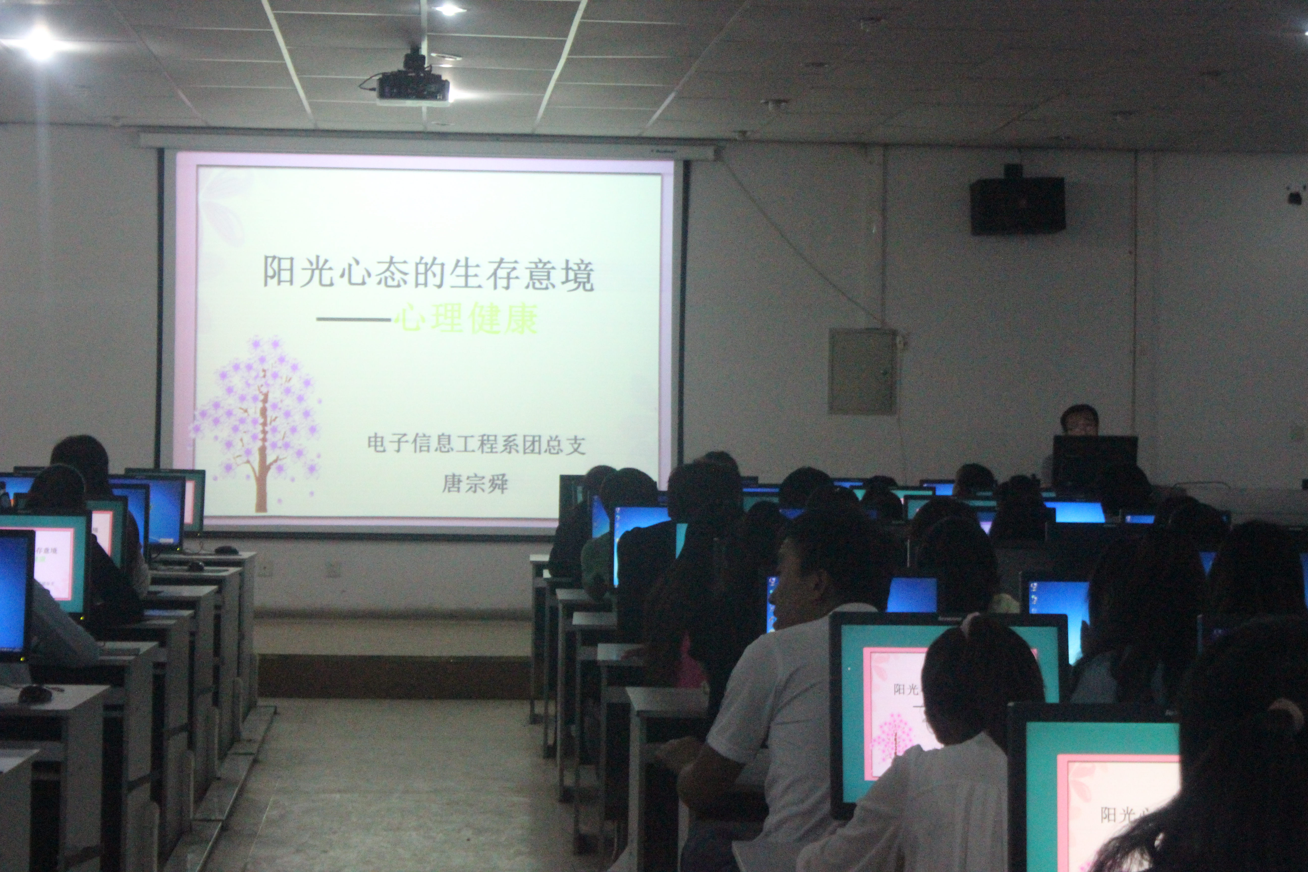 為了進(jìn)一步推進(jìn)大學(xué)生心理健康教育宣傳工作深入開展,在學(xué)生中營(yíng)造一種學(xué)習(xí)、普及、宣傳心理健康知識(shí),關(guān)心、理解、幫助有心理困擾的同學(xué),共同創(chuàng)造良好氛圍,促進(jìn)大學(xué)生健康成長(zhǎng),以適應(yīng)新時(shí)代、新環(huán)境需要。5月26日晚8時(shí),電子信息工程系在學(xué)院十號(hào)機(jī)房舉辦心理健康教育專題講座。