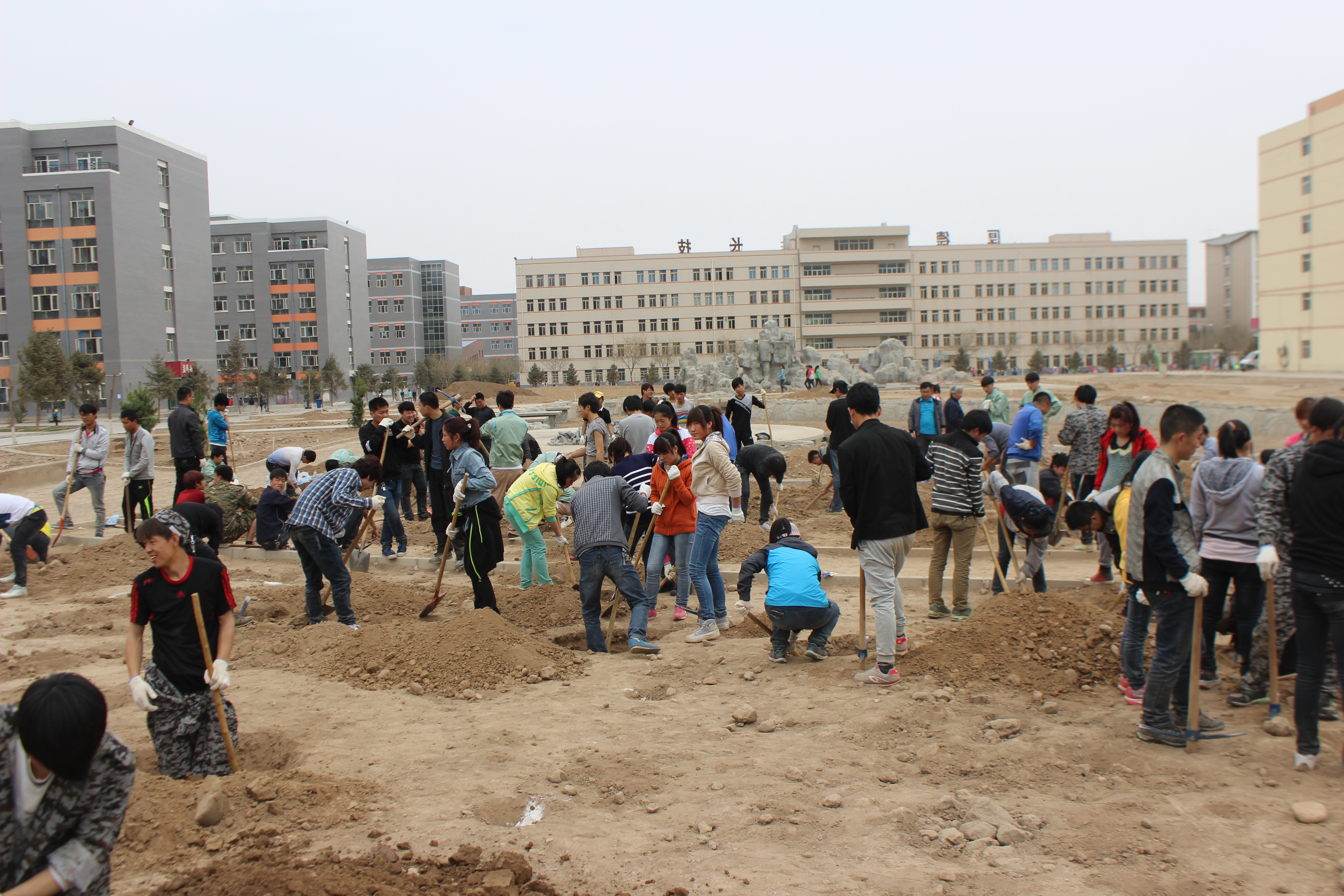 在植樹現(xiàn)場,220名師生積極投入到植樹活動中。他們用镢頭、鐵锨挖開樹坑,放入樹苗,然后細心地往坑中填土;樹苗栽好后認真地扶正樹苗、踩實新土,整個植樹現(xiàn)場一片忙碌。經(jīng)過全系師生的共同努力,完成了學院一期擴建景觀工程和體育場西側(cè)圍墻共200多棵樹苗的栽種任務。