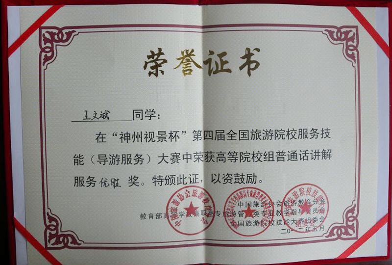 學(xué)生王文斌、凌小花、成玉玲榮獲“神州視景杯”第四屆全國旅游院校服務(wù)技能(導(dǎo)游技能)大賽優(yōu)秀獎(jiǎng)。
