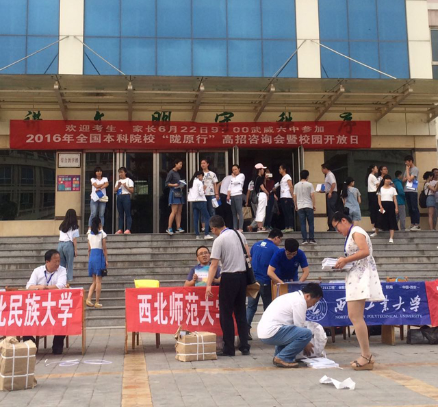 同一天,招生就業(yè)處還選派老師參加了在武威六中舉行的由《未來(lái)導(dǎo)報(bào)》主辦的“2016年全國(guó)本科院?!]原行’高招咨詢會(huì)”,就考生和家長(zhǎng)關(guān)心的相關(guān)熱點(diǎn)問題進(jìn)行了現(xiàn)場(chǎng)答疑解惑,考生及家長(zhǎng)表示對(duì)他們掌握各院校熱門專業(yè)和報(bào)考要求有很大幫助。