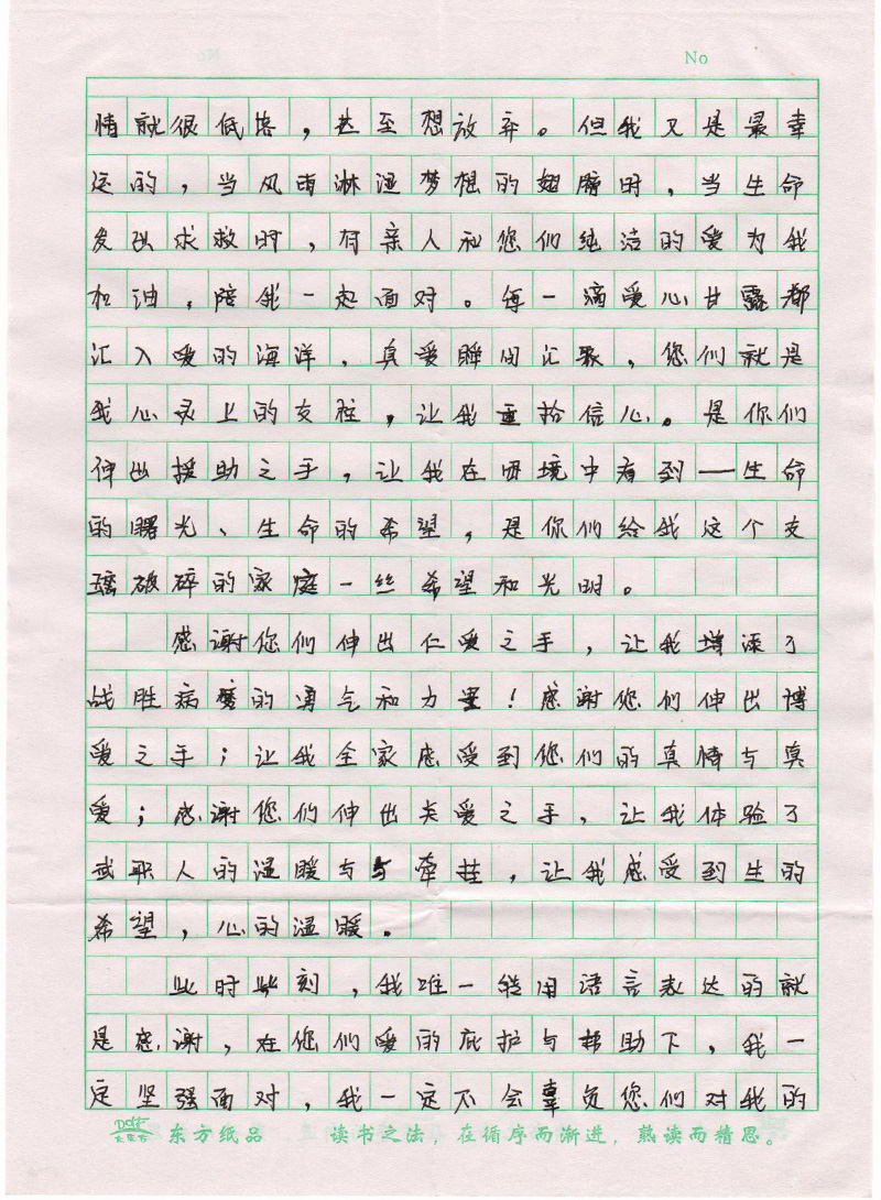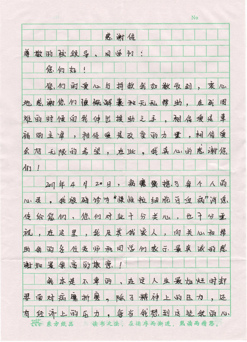 高國棟是我院機械制造系2015級機械設計與制造大專班學生,于2017年4月確診為慢性粒細胞白血病。得知這一特殊情況后,學院宣傳統(tǒng)戰(zhàn)部、團委、學生工作處第一時間向全院廣大師生發(fā)出倡議,號召大家獻出愛心,幫助高國棟同學度過難關(guān)。學院廣大師生紛紛解囊,慷慨相助。目前捐助的善款已經(jīng)交給高國棟同學。為此,高國棟同學特意寫來感謝信,表達對母校廣大師生的感激之情。在此,我們衷心祝愿高國棟同學能在困境中迎難而上,樹立戰(zhàn)勝疾病的信心,爭取早日康復,重返校園。