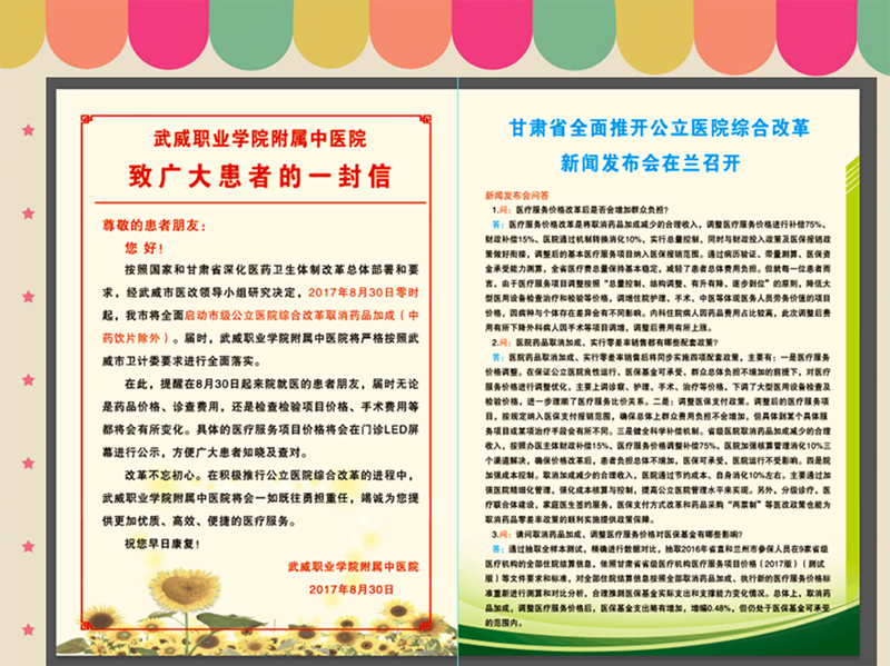 為了搞好公立醫(yī)院綜合改革,醫(yī)院加大對啟動公立醫(yī)院綜合改革工作的宣傳力度,通過醫(yī)院門診大廳LED屏幕、電子顯示屏、宣傳展架、宣傳彩頁及微信公眾號推送等多種方式擴大醫(yī)院綜合改革宣傳,對患者及家屬做好正面引導工作,為醫(yī)院綜合改革任務的落實營造良好的氛圍。