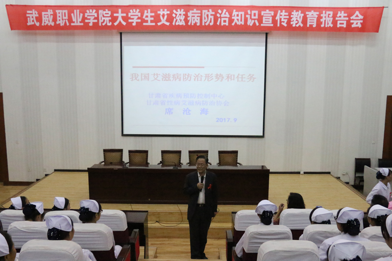9月21日晚,甘肅省性病艾滋病防治協(xié)會副會長、甘肅省艾滋病首席專家、主任醫(yī)師席倉海教授在學(xué)院正德廳為我院學(xué)生作了一場“大學(xué)生艾滋病防治知識宣傳教育”講座,講座由市疾控中心主任楊天琳主持,學(xué)院護(hù)理系黨總支書記張建輝、市疾控中心性病艾滋病科科長王永瑚、市中心血站血源科科長邢志勇及學(xué)院各級團(tuán)干部和紅絲帶協(xié)會共280多人聆聽了講座。