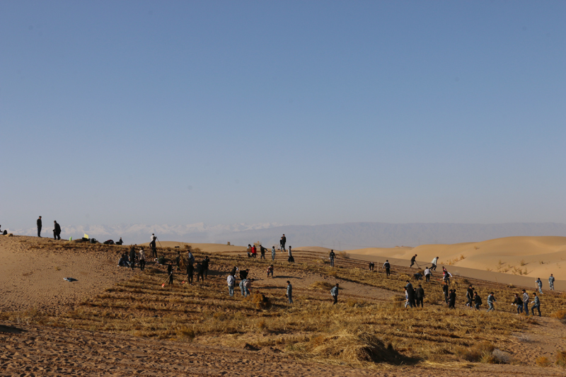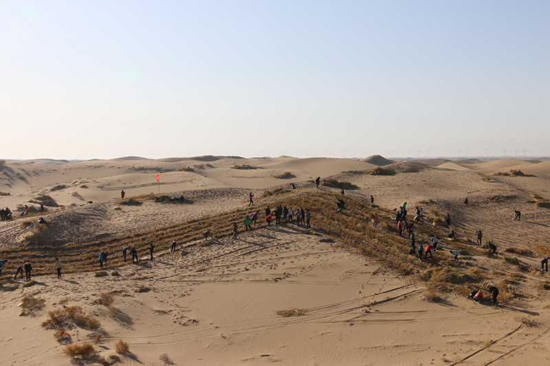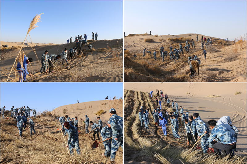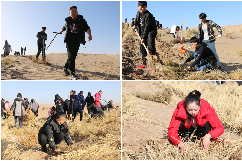 在勞動現(xiàn)場,學(xué)院領(lǐng)導(dǎo)和師生們不畏冬寒,分工協(xié)作,按照標(biāo)準(zhǔn)和要求劃線開溝、蒲草培沙、等距離推進(jìn),現(xiàn)場一片熱火朝天的景象?;氖彽纳车厣砼乱?,整齊的稻草方格逐漸向遠(yuǎn)處的沙丘覆蓋。